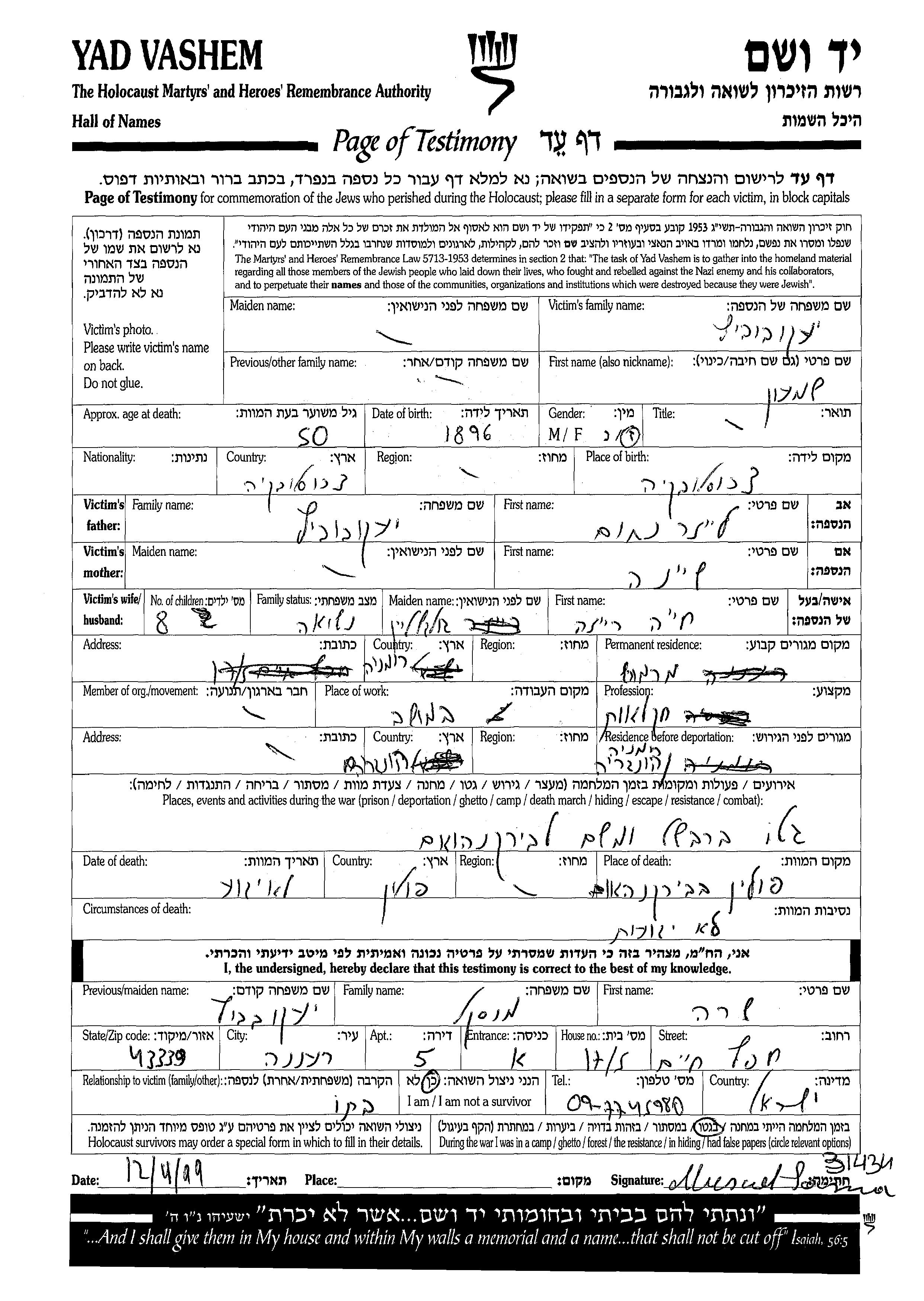 Shimon wurde in der Schoah ermordet. Todesort: Birkenau, Polen.