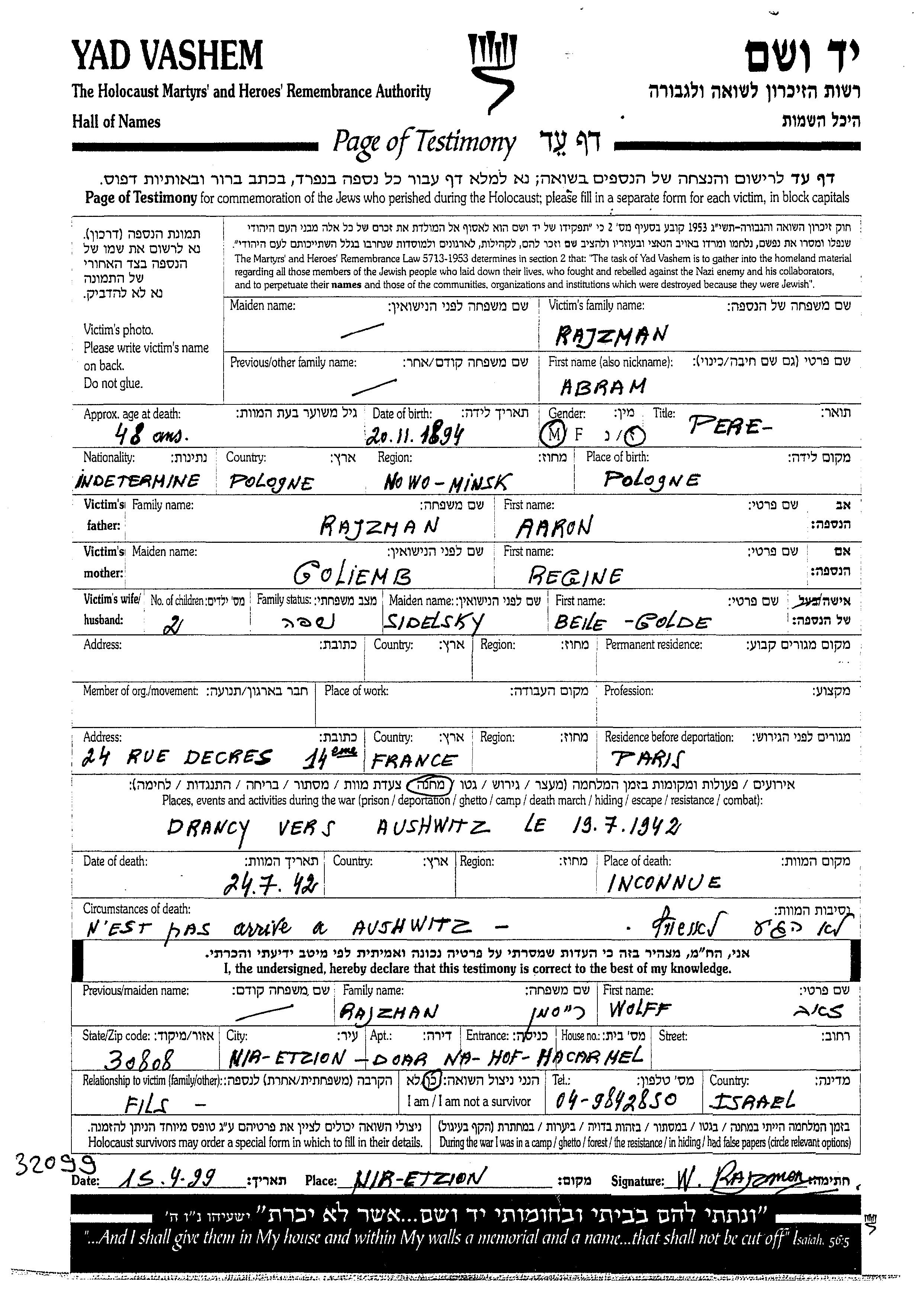 Abram Rajzman wurde im Jahr 1894 in Nowo Minsk, Polen geboren. Er war der Sohn von Aaron und Regine, geb. Goliemb. Er war mit Golde Beile, geb. Sidelsky Verheiratet. Während des Krieges war er in Paris, Frankreich.