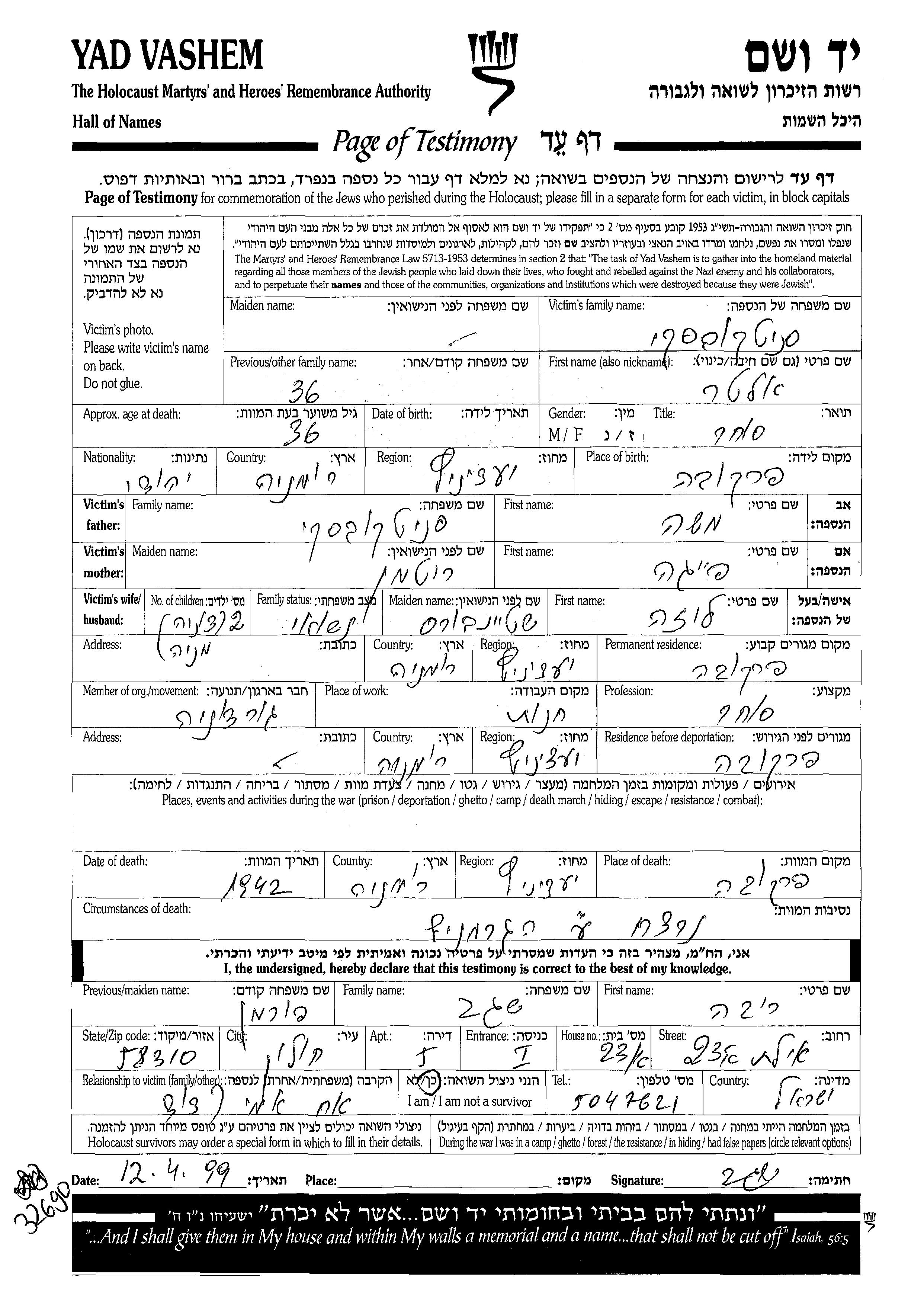 Alter wurde in der Schoah ermordet. Todesort: Parcova, Rumänien im Jahr 1942.