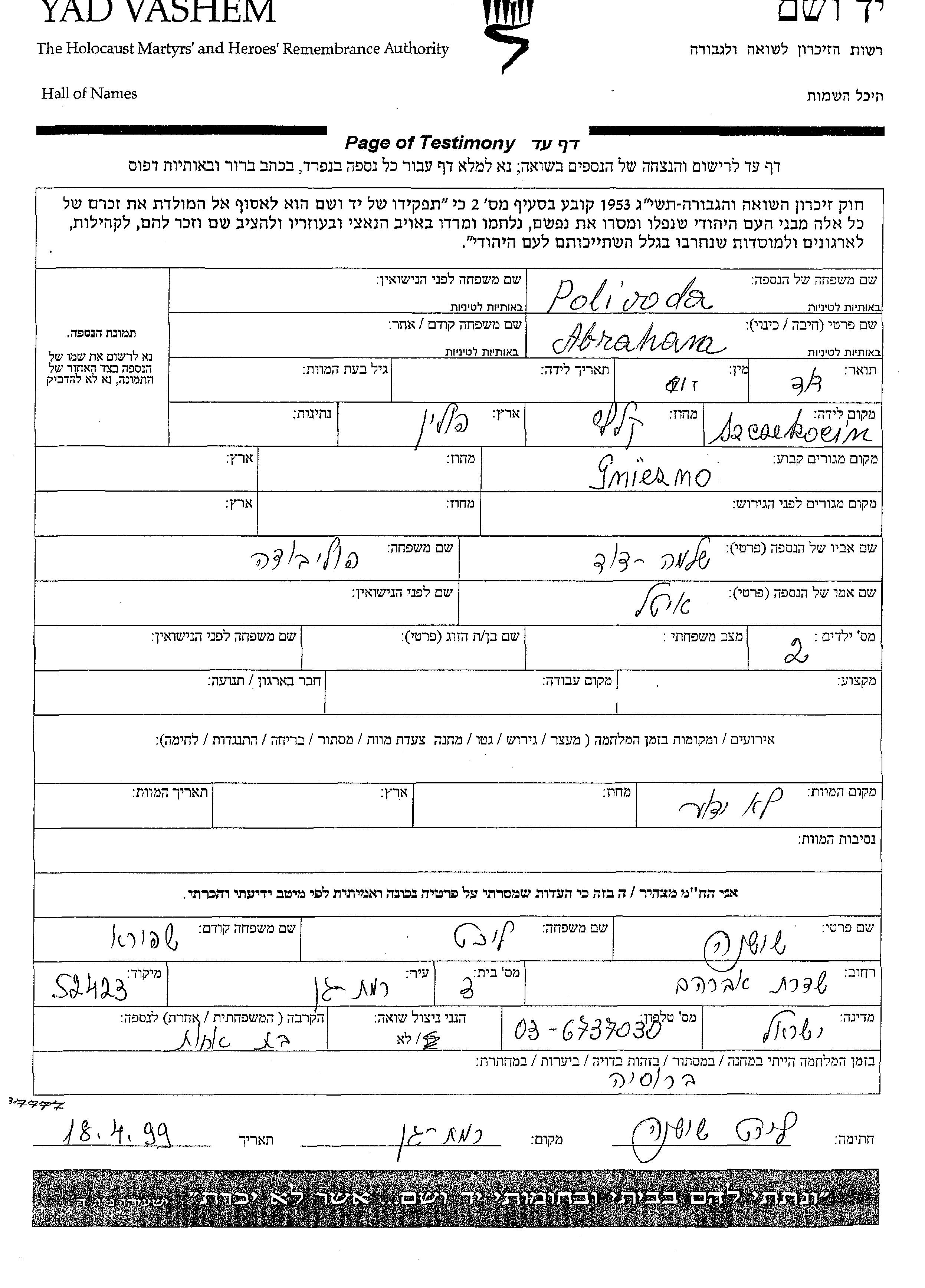 Abraham Polivoda wurde in Szczekocin, Polen geboren. Er war der Sohn von David Shlomo und Ita. Vor dem Zweiten Weltkrieg lebte er in Gniezno, Polen.