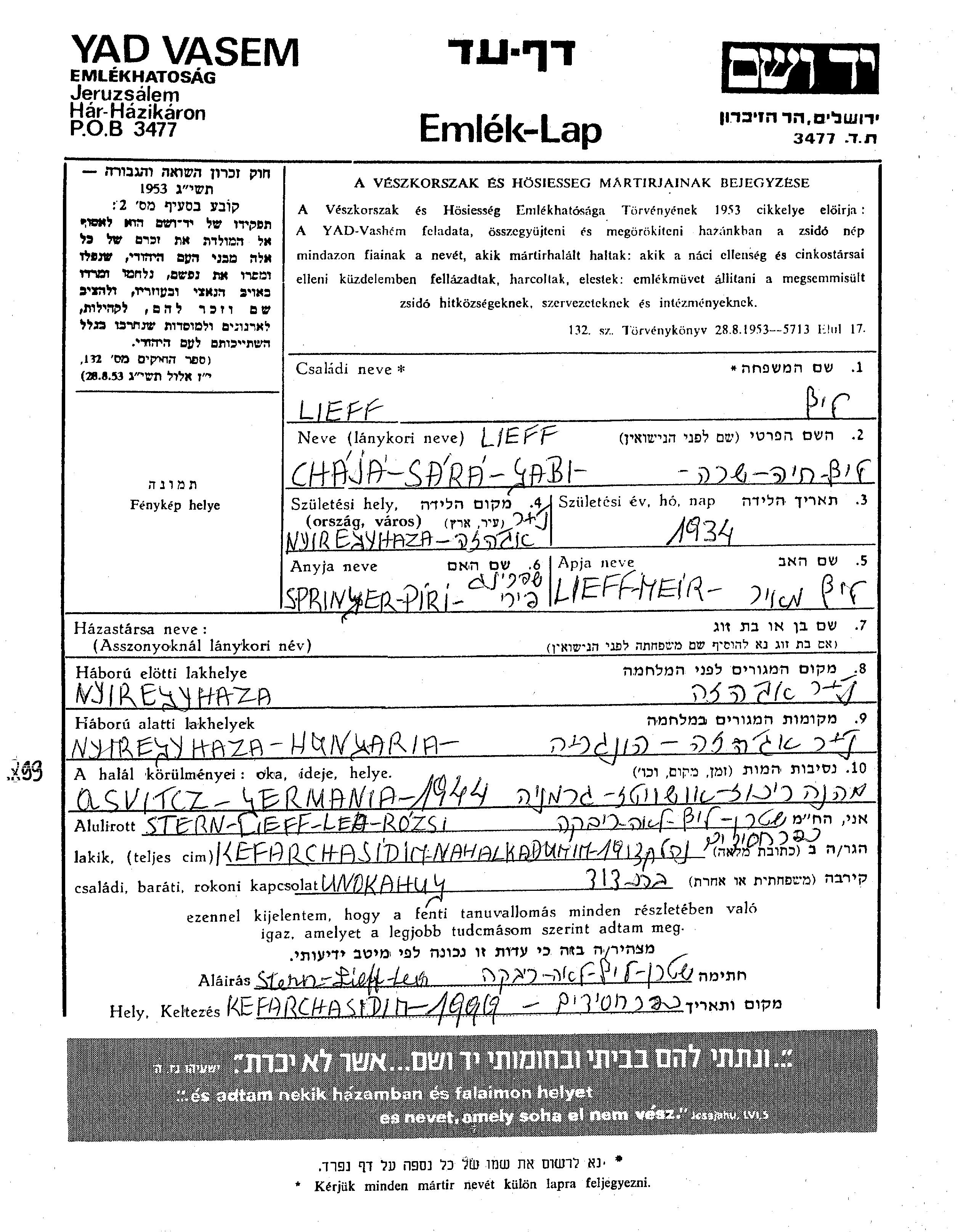 Gabi Sara Chaja Lieff Lif wurde im Jahr 1934 in Nyiregyhaza, Ungarn geboren. Sie war die Tochter von Meir und Piri, geb. Shpringer. Sie war Kind. Vor dem Zweiten Weltkrieg lebte sie in Nyiregyhaza, Ungarn. Während des Krieges war sie in Nyiregyhaza, Ungarn.