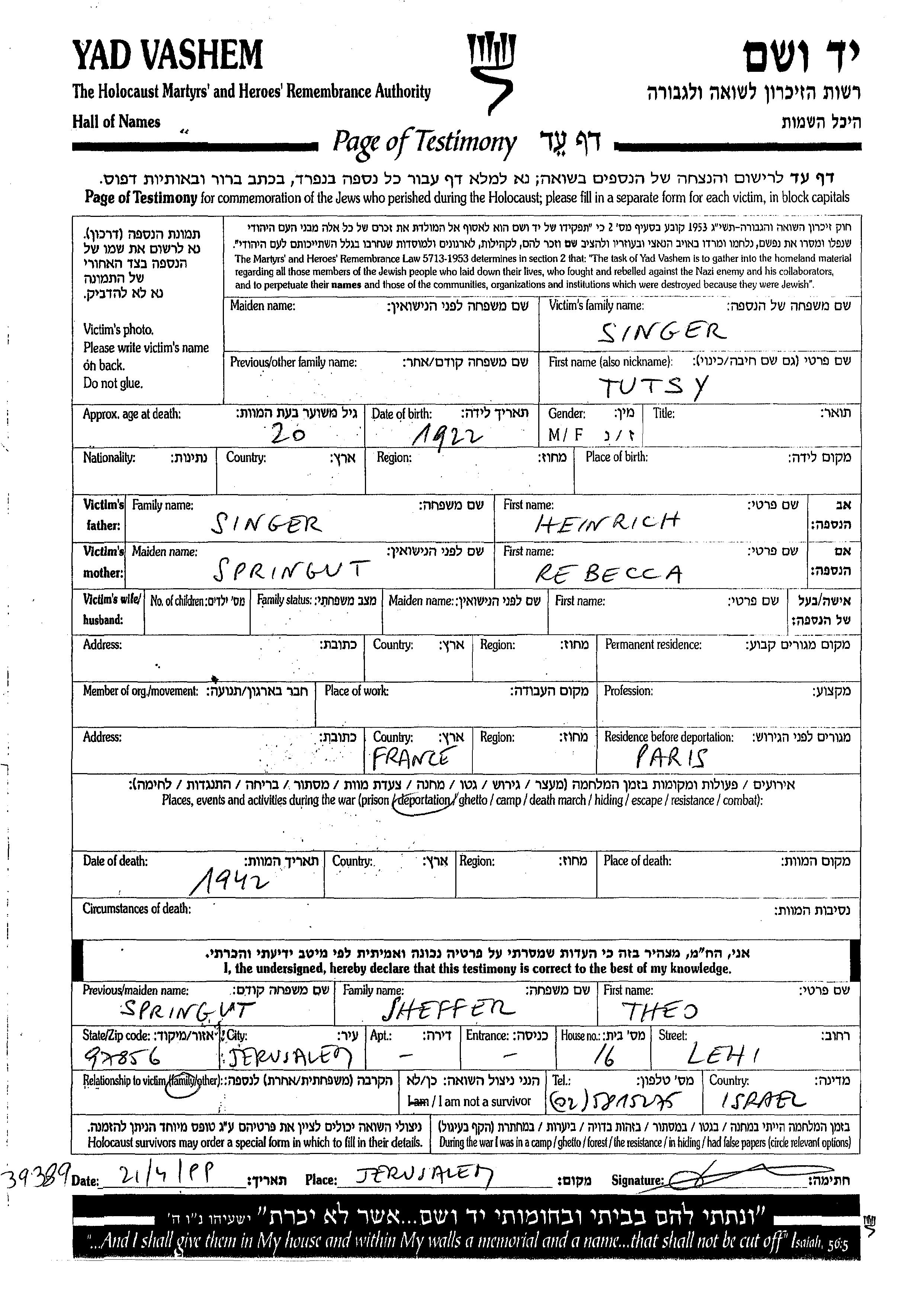 Tutsy Singer wurde im Jahr 1922 geboren. Sie war die Tochter von Heinrich und Rebecca, geb. Springut. Während des Krieges war sie in Paris, Frankreich.