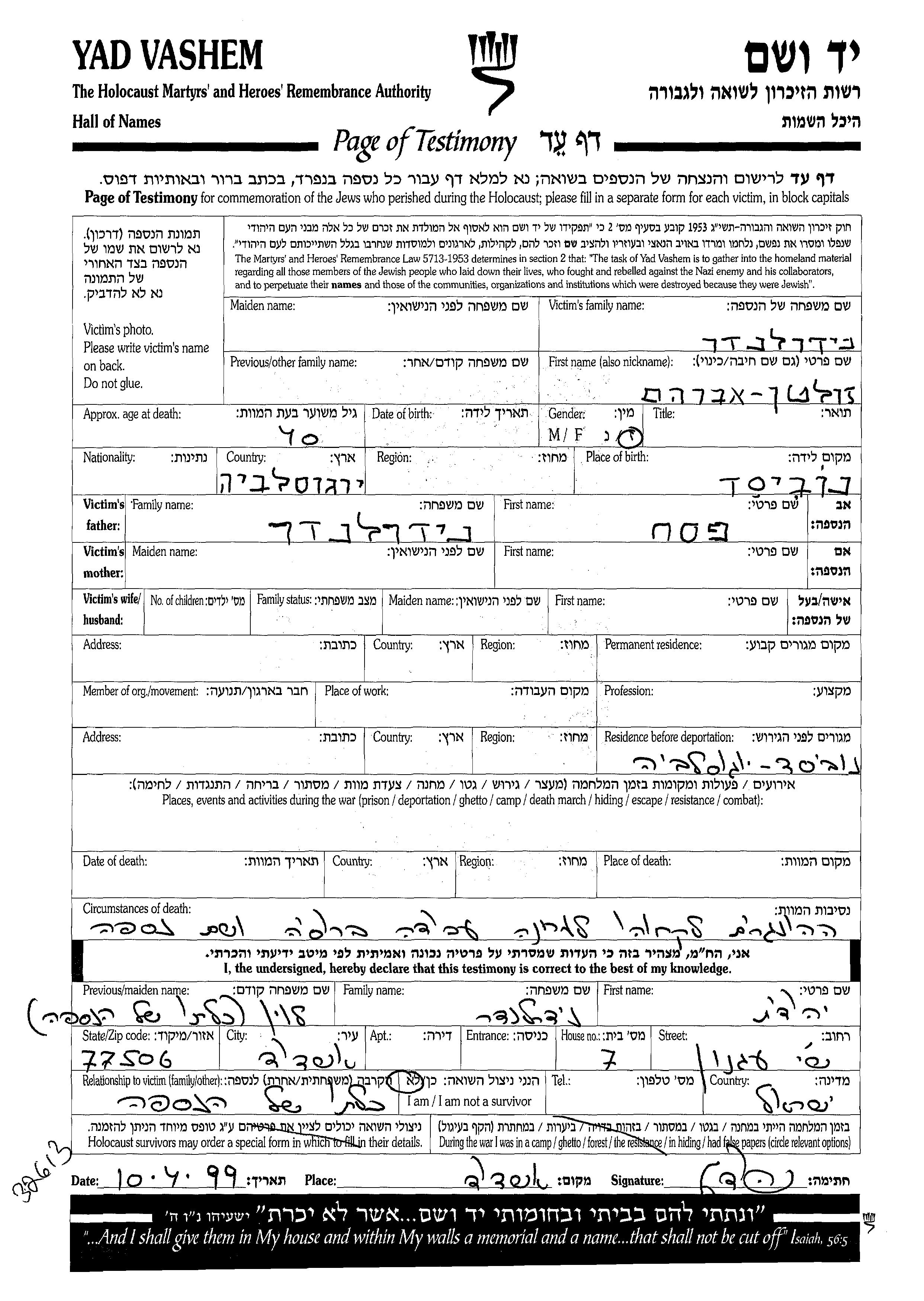 Niderlender Zoltan Avraham unbekannter Ort, Gedenkblatt