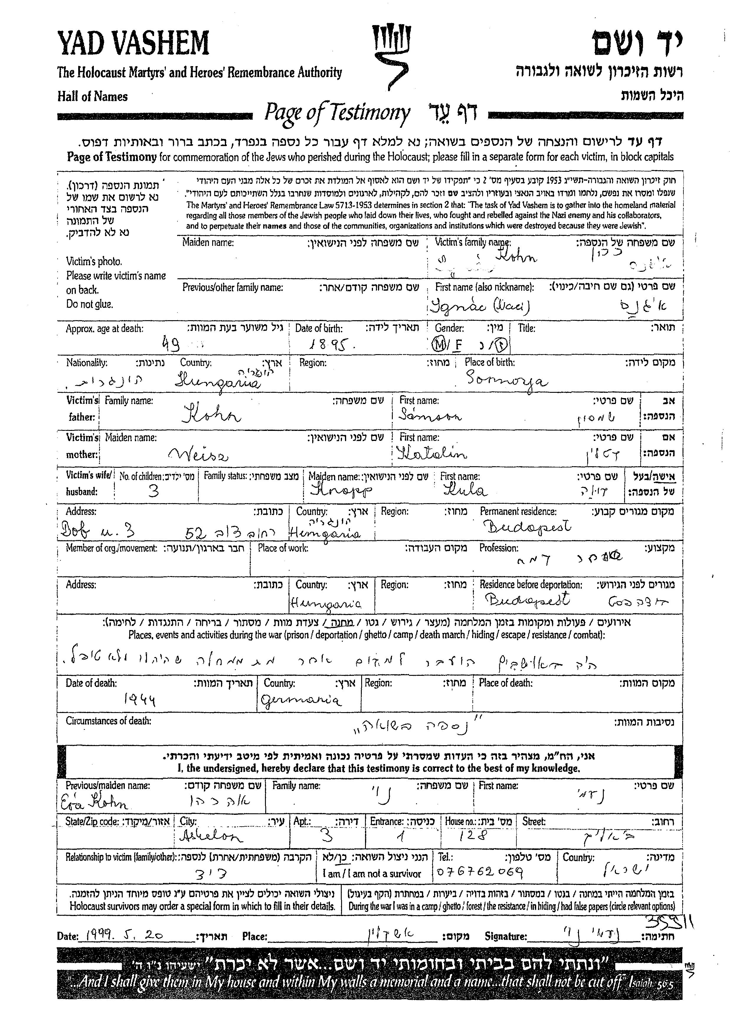 Ignac Kohen wurde im Jahr 1895 in Somorja, Tschechoslowakei geboren. Er war der Sohn von Shimshon und Katelin, geb. Weisz. Er war Mehlhändler. Vor dem Zweiten Weltkrieg lebte er in Budapest, Ungarn. Während des Krieges war er in Budapest, Ungarn.