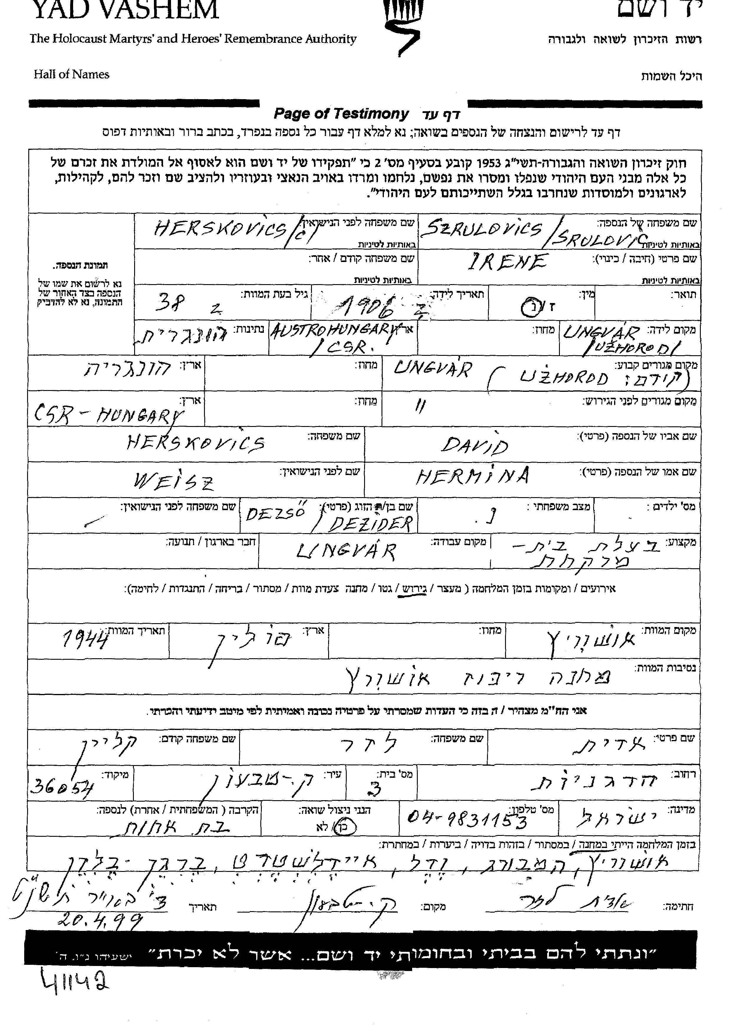 Irene Srulovic, geb. Herskovics wurde im Jahr 1906 in Ungvar, Tschechoslowakei geboren. Sie war die Tochter von David. Sie war Apotheker und mit Hermina, geb. Weisz Verheiratet. Vor dem Zweiten Weltkrieg lebte sie in Ungvar, Tschechoslowakei. Während des Krieges war sie in Ungvar, Tschechoslowakei.