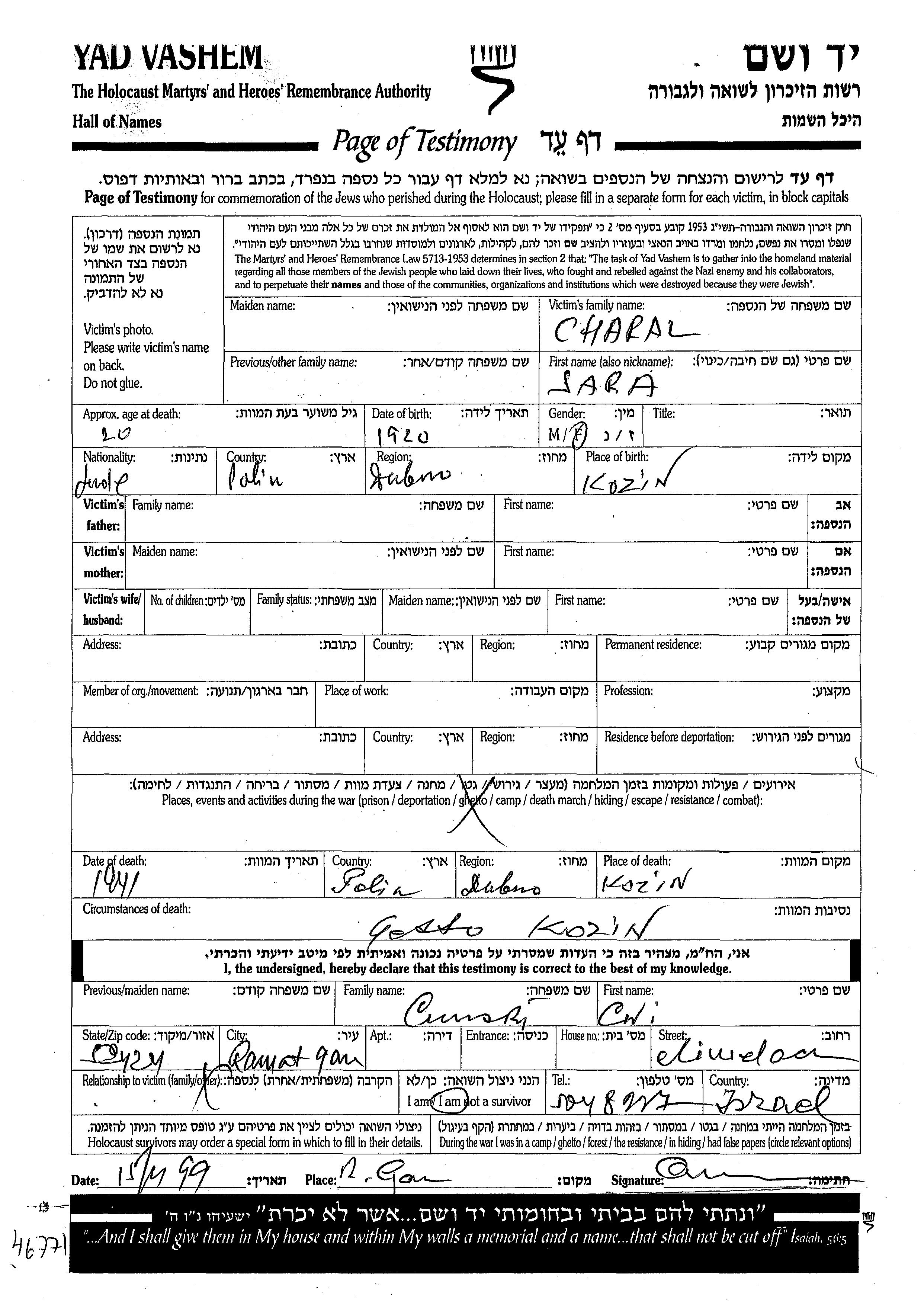Sara Charal wurde im Jahr 1920 in Kozin, Polen geboren. Sie war Ledig.