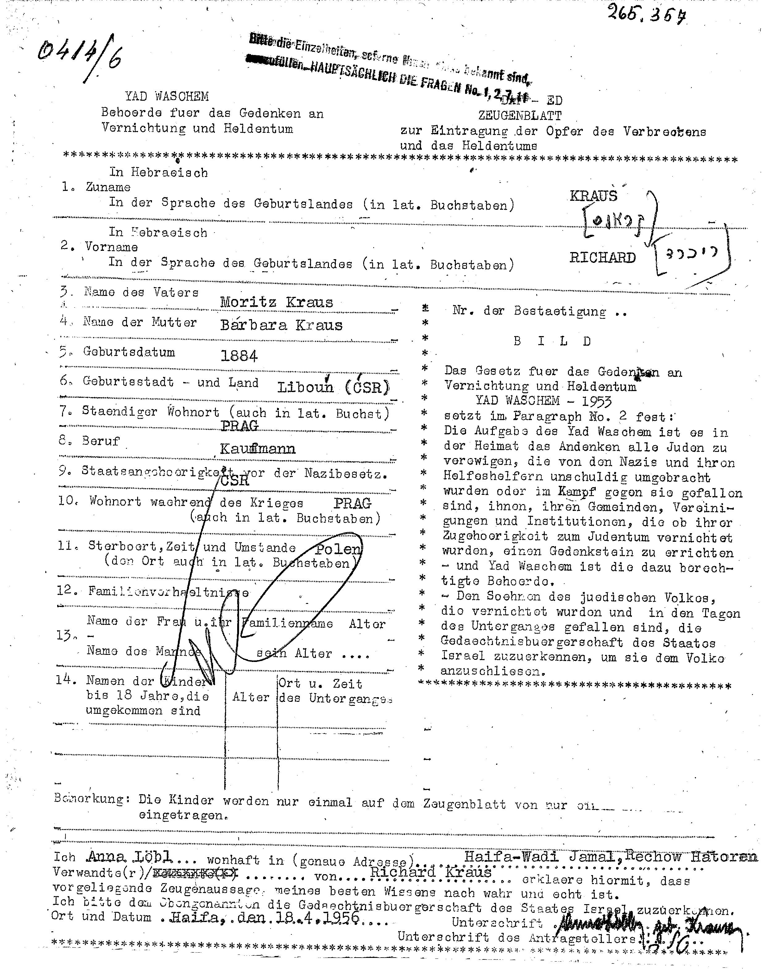 Richard Kraus wurde im Jahr 1884 in Liboun, Tschechoslowakei geboren. Er war der Sohn von Moritz und Barbara. Er war Kaufmann/-frau. Vor dem Zweiten Weltkrieg lebte er in Prag, Tschechoslowakei. Während des Krieges war er in Prag, Tschechoslowakei.