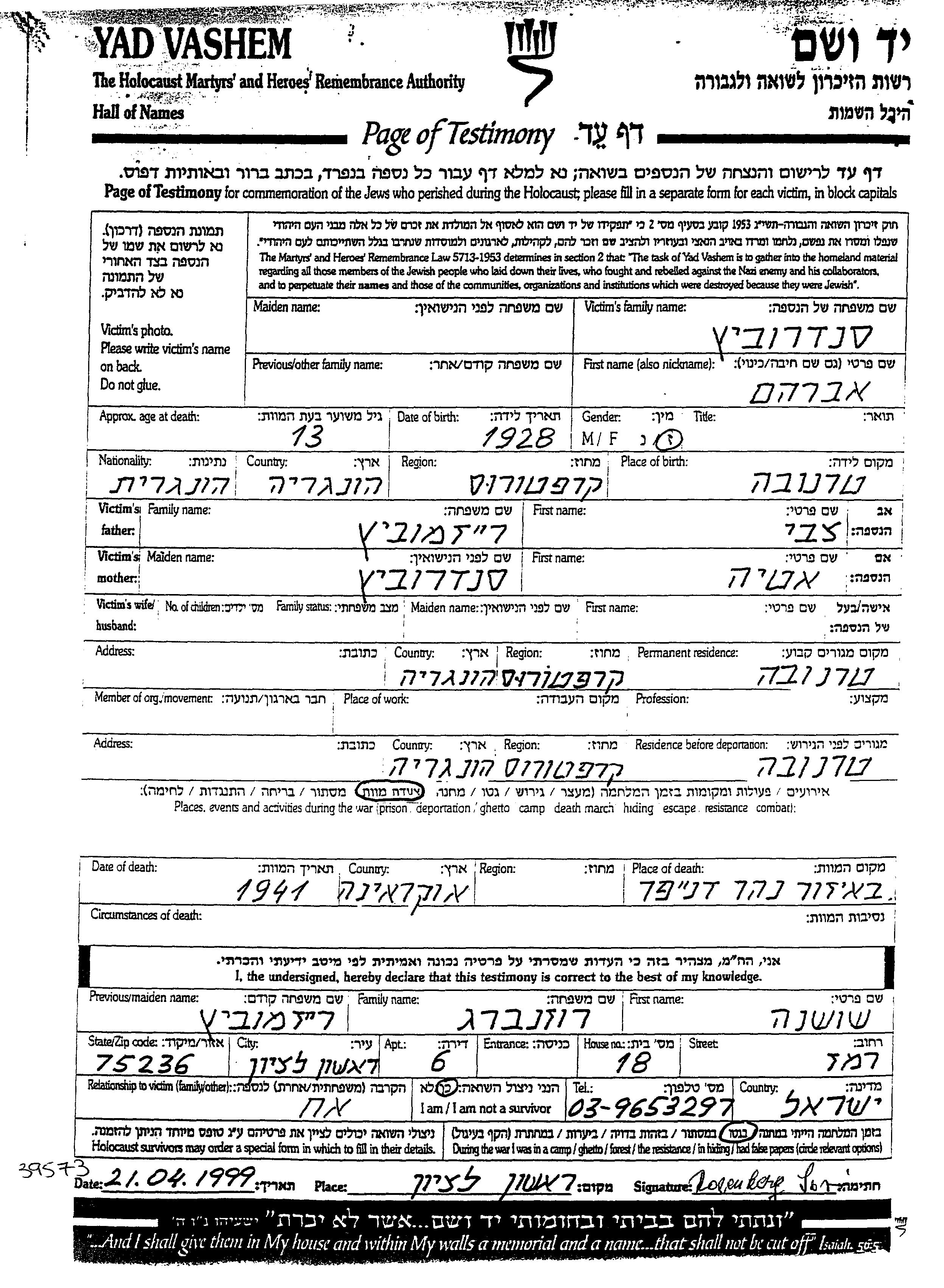 Sanderovitz Avraham 1928 Tarnava, Tschechoslowakei Gedenkblatt