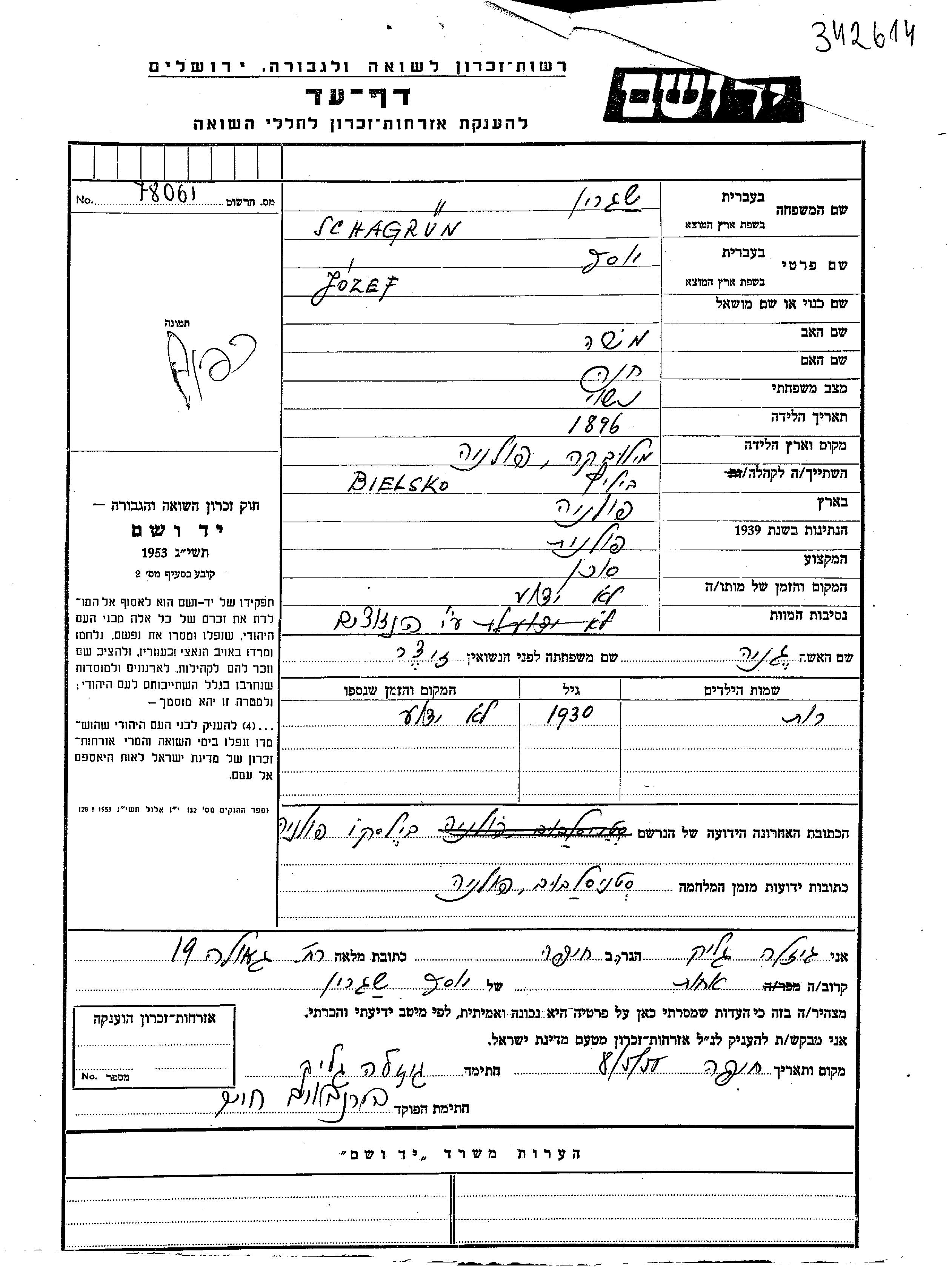 Jozef Schagruen wurde im Jahr 1896 in Milowka, Polen geboren. Er war der Sohn von Moshe und Khana. Er war Vertreter/-in und mit Genya, geb. Zitzer Verheiratet. Vor dem Zweiten Weltkrieg lebte er in Bielsko, Polen. Während des Krieges war er in Stanislawow, Polen.