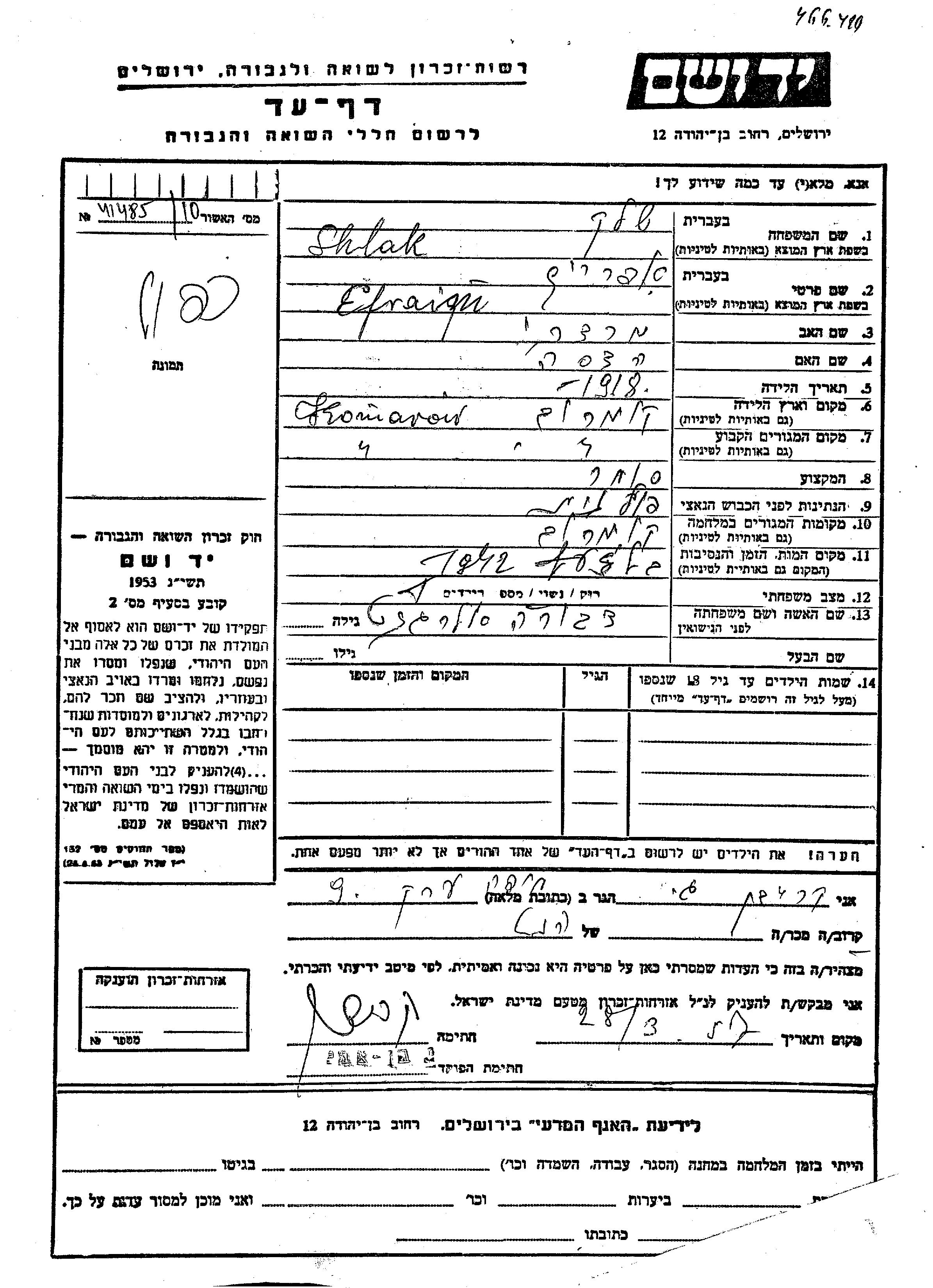 Efraim Shlak wurde im Jahr 1918 in Komarow geboren. Er war der Sohn von Mordekhai und Hadasa. Er war Kaufmann/-frau und mit Dvora, geb. Alergant Verheiratet. Vor dem Zweiten Weltkrieg lebte er in Komarow. Während des Krieges war er in Komarow.