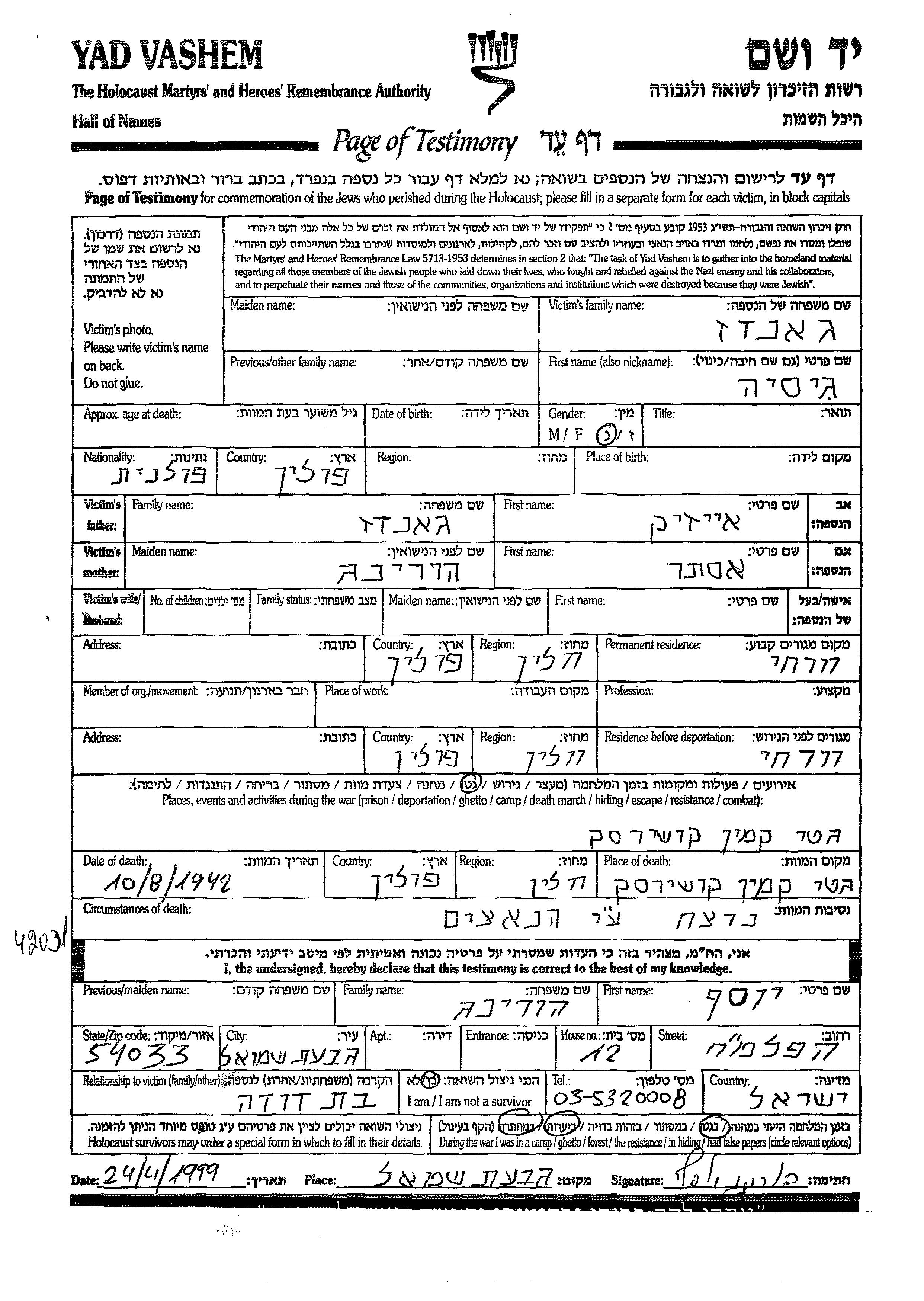 Gisia wurde in der Schoah ermordet. Todesort: Kamien Koszyrski, Polen im Jahr 10/08/1942.