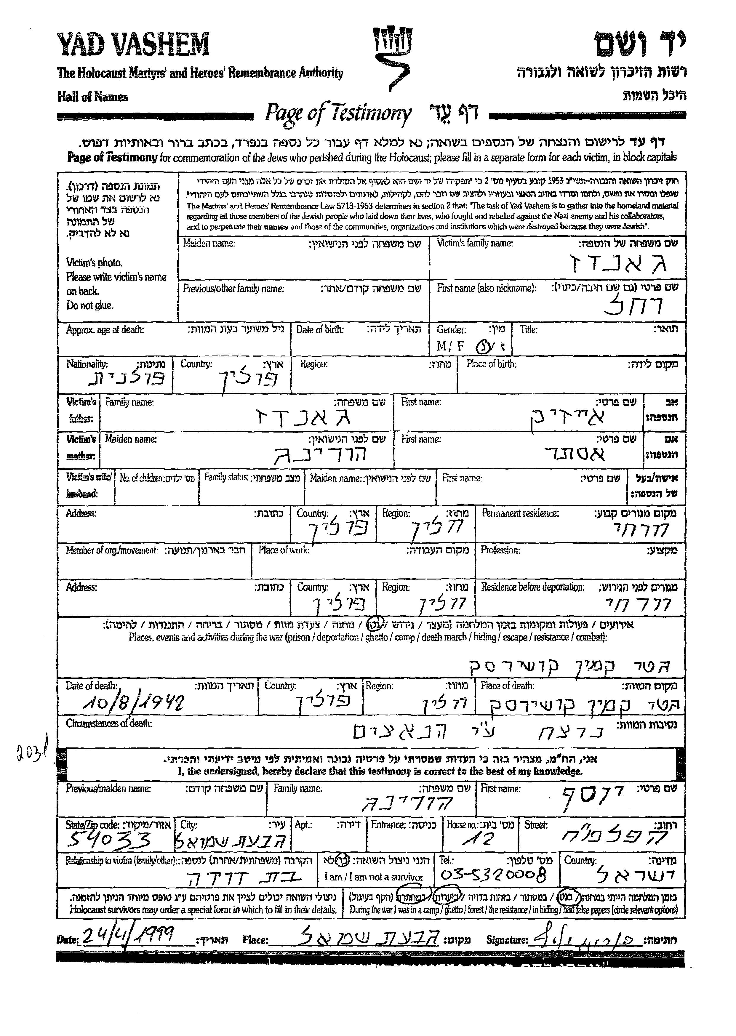 Rakhel wurde in der Schoah ermordet. Todesort: Kamien Koszyrski, Polen im Jahr 10/08/1942.