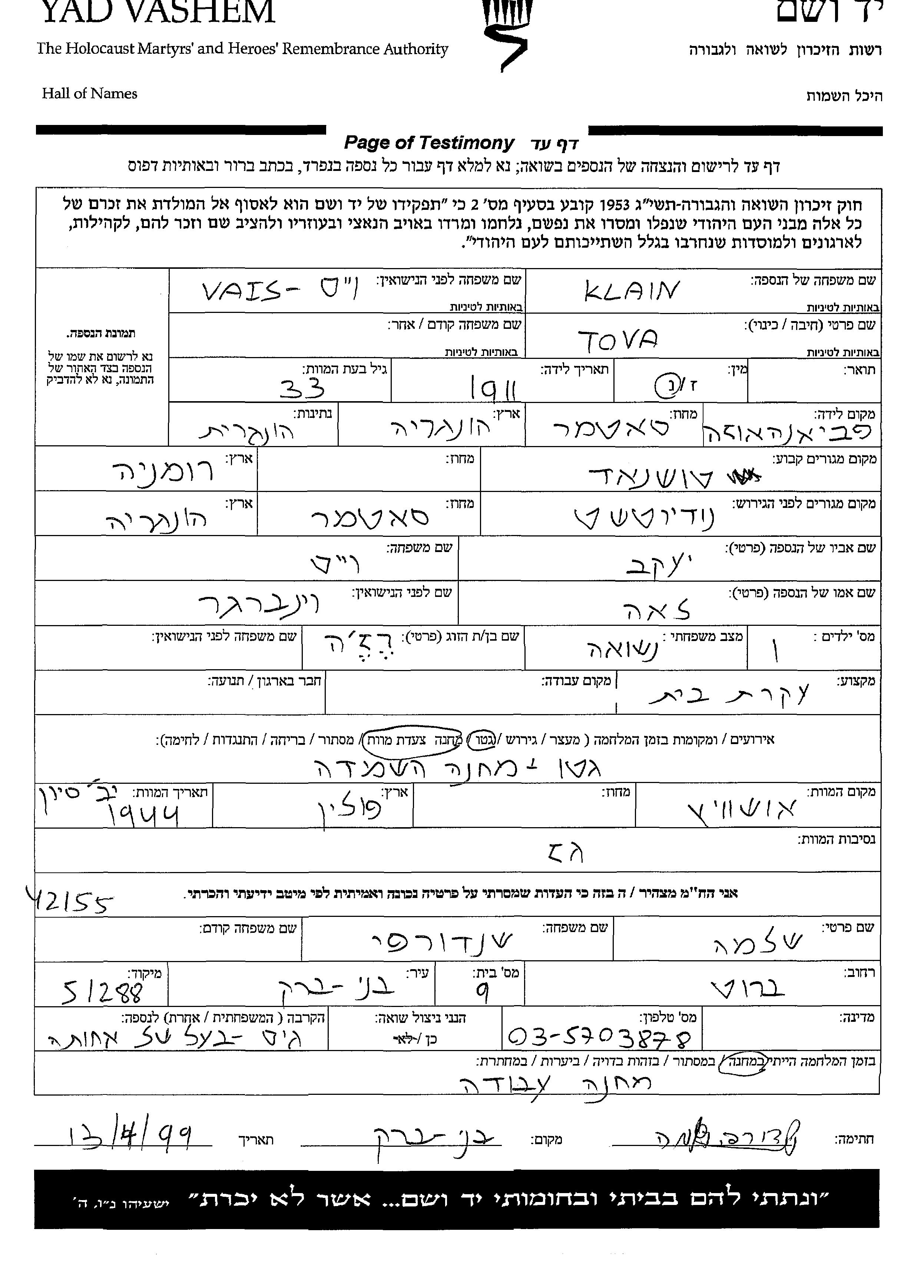 Tova Klain, geb. Veis wurde im Jahr 1911 in Fabianhaza, Ungarn geboren. Sie war die Tochter von Yaakov und Lea, geb. Veinberger. Sie war Hausfrau und mit Reze Verheiratet. Vor dem Zweiten Weltkrieg lebte sie in Tasnad, Rumänien. Während des Krieges war sie in Neustadt, Rumänien.