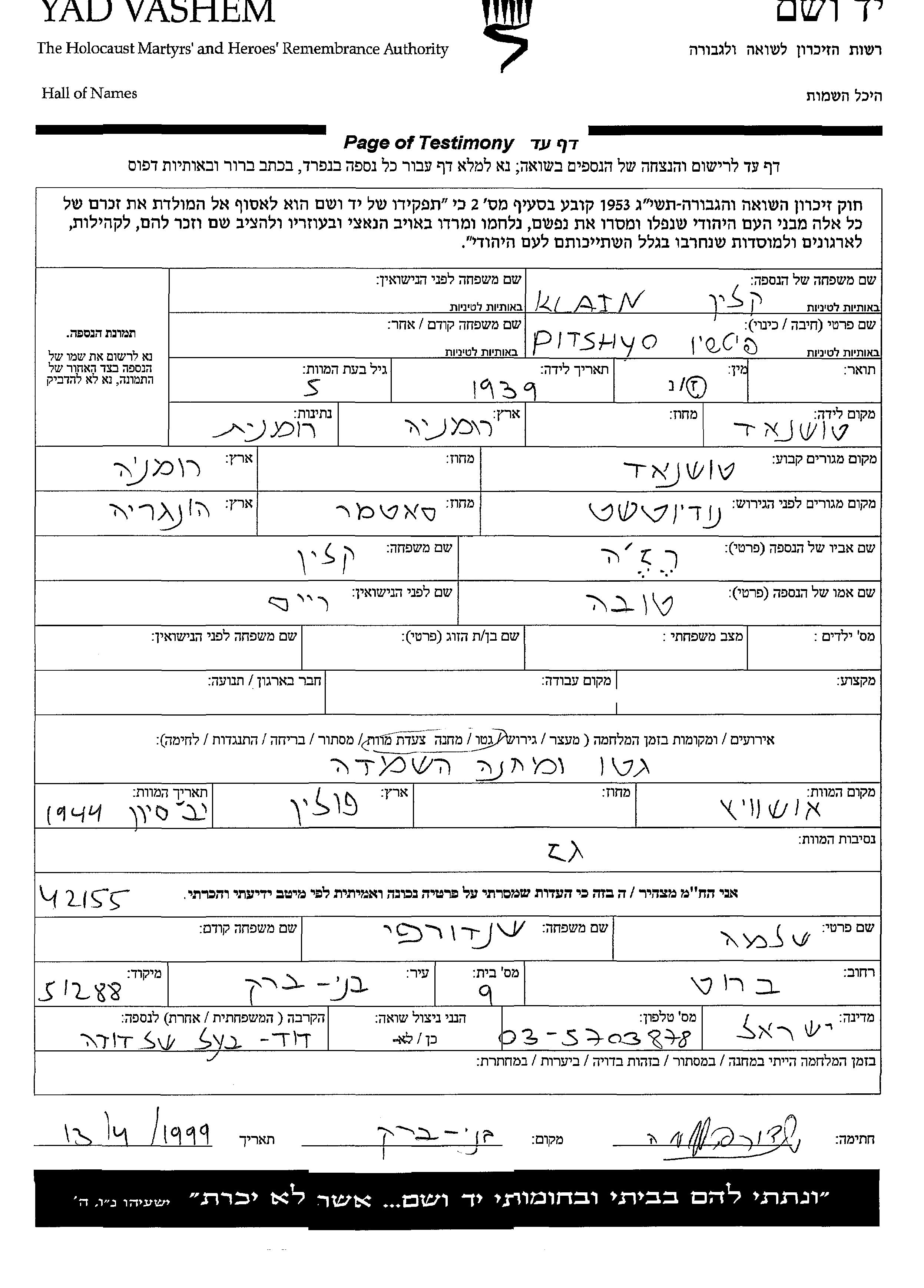 פיטשיו Klain Klin wurde im Jahr 1939 in Tusnad, Rumänien geboren. Er war der Sohn von Reze und Tova, geb. Reis. Vor dem Zweiten Weltkrieg lebte er in Tusnad, Rumänien. Während des Krieges war er in Neustadt, Rumänien.