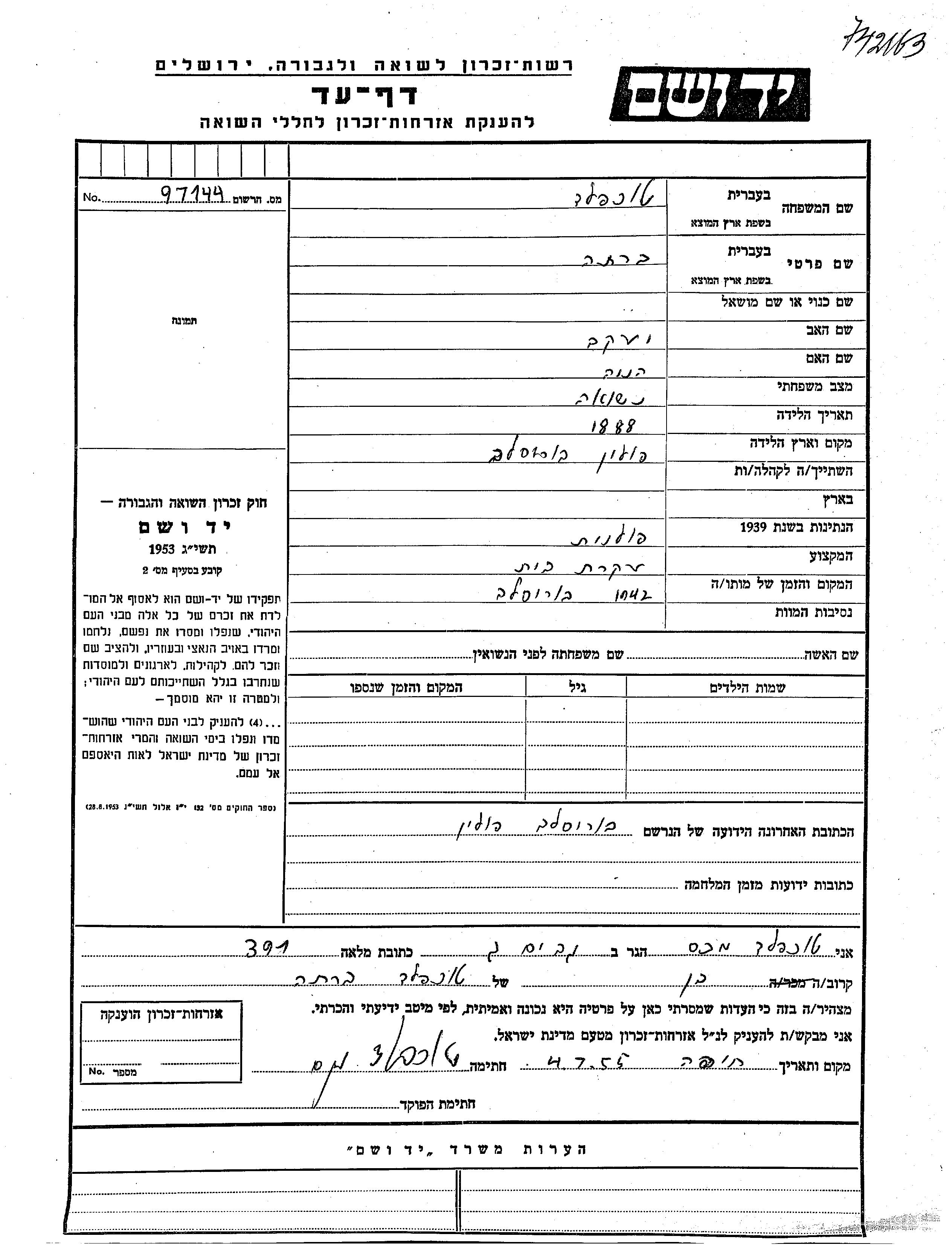 Berta Tukhfeld wurde im Jahr 1888 in Boryslaw, Polen geboren. Sie war die Tochter von Yaakov und Henia. Sie war Hausfrau und Verheiratet. Vor dem Zweiten Weltkrieg lebte sie in Boryslaw, Polen.