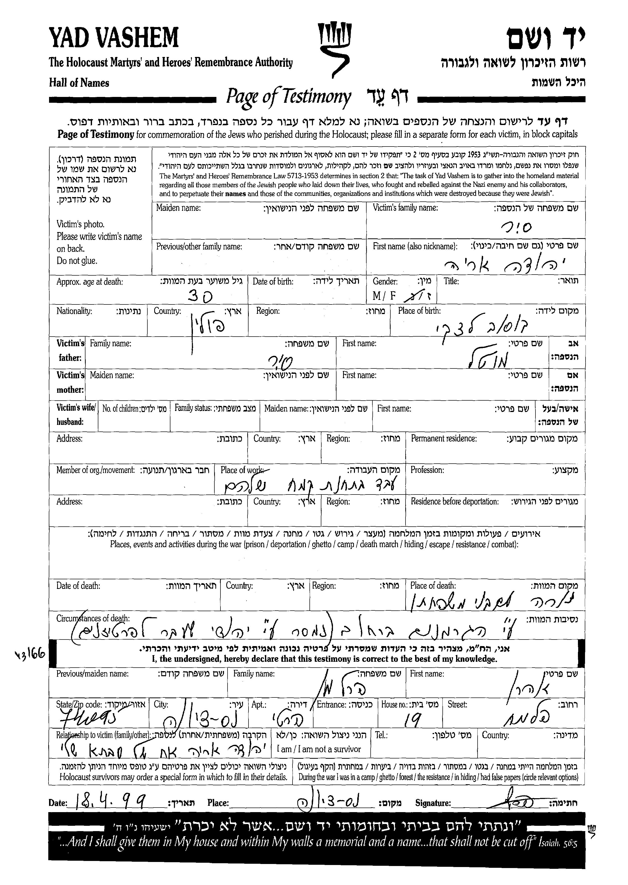 Sor Arie Yehuda unbekannter Ort, Gedenkblatt