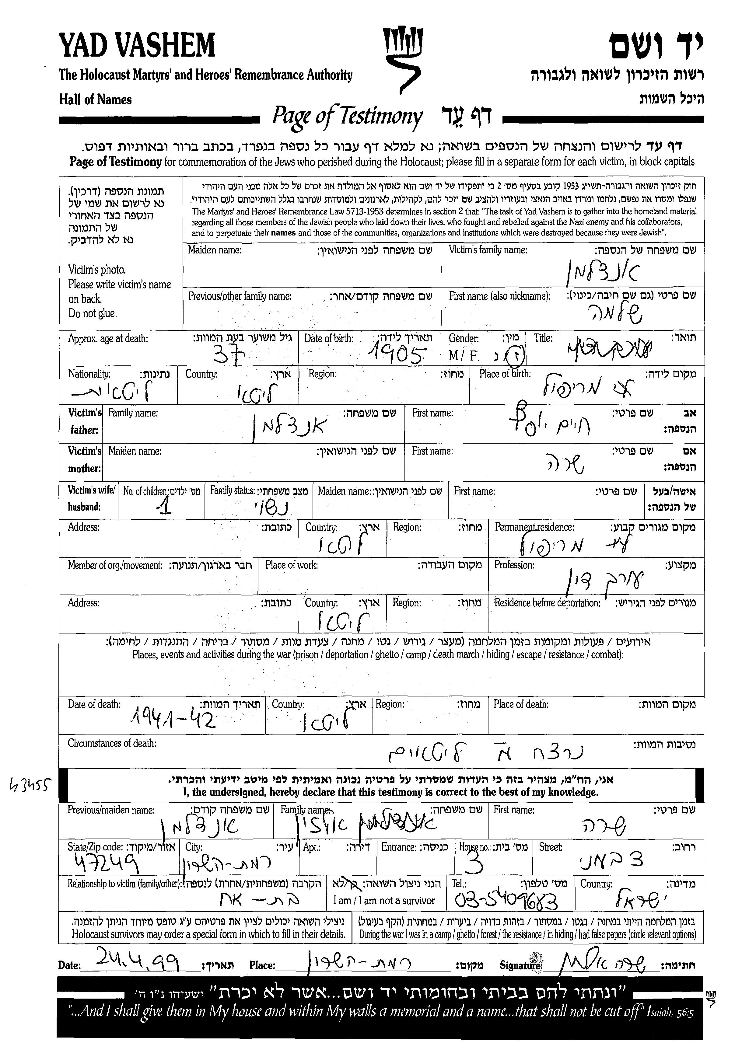 Endelman Shlomo 1905 Marijampole, Litauen Gedenkblatt