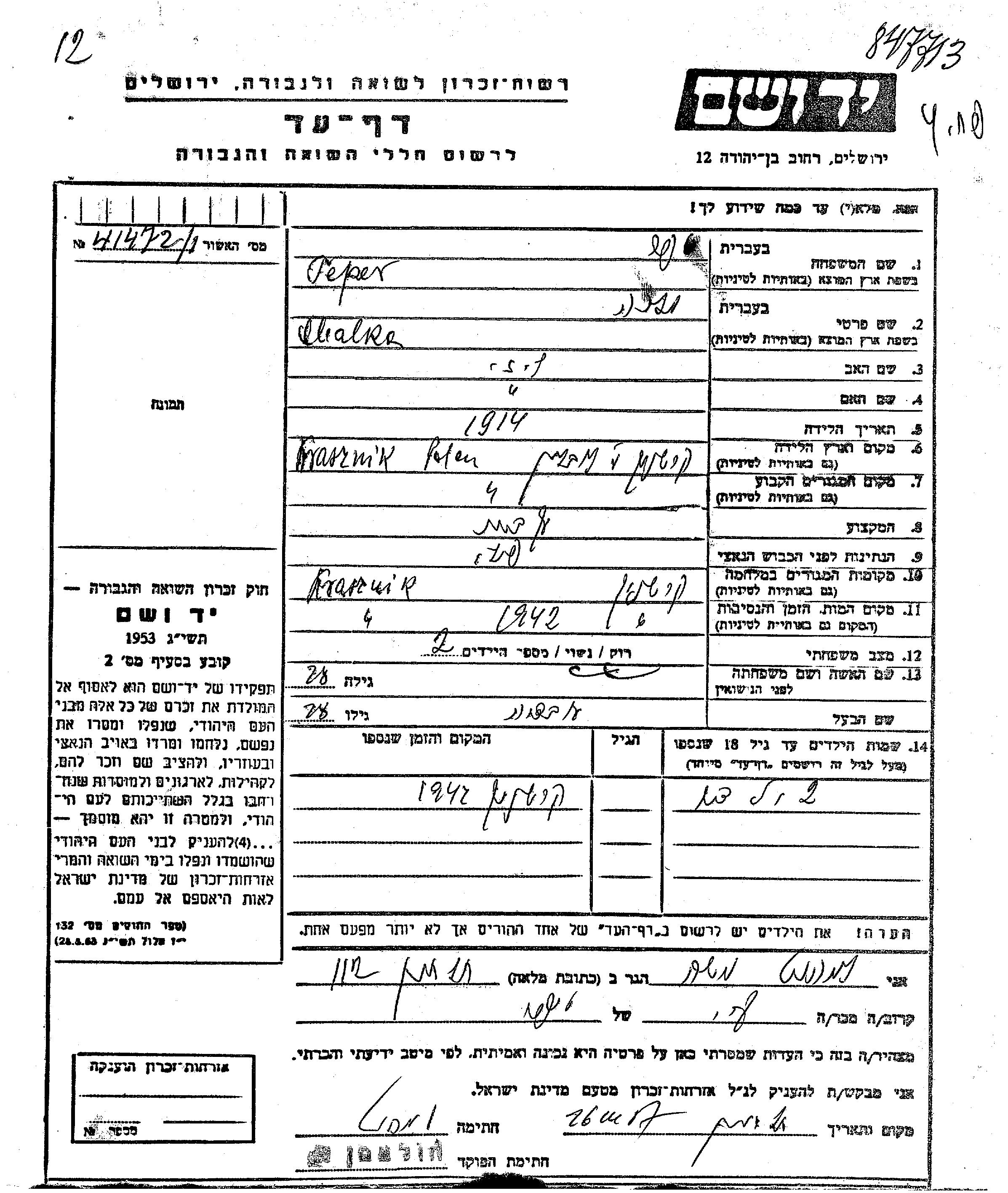 Malka Teper wurde im Jahr 1914 in Krasznik, Polen geboren. Sie war Hausfrau und mit Ovadia Verheiratet. Vor dem Zweiten Weltkrieg lebte sie in Krasznik, Polen. Während des Krieges war sie in Krasznik, Polen.