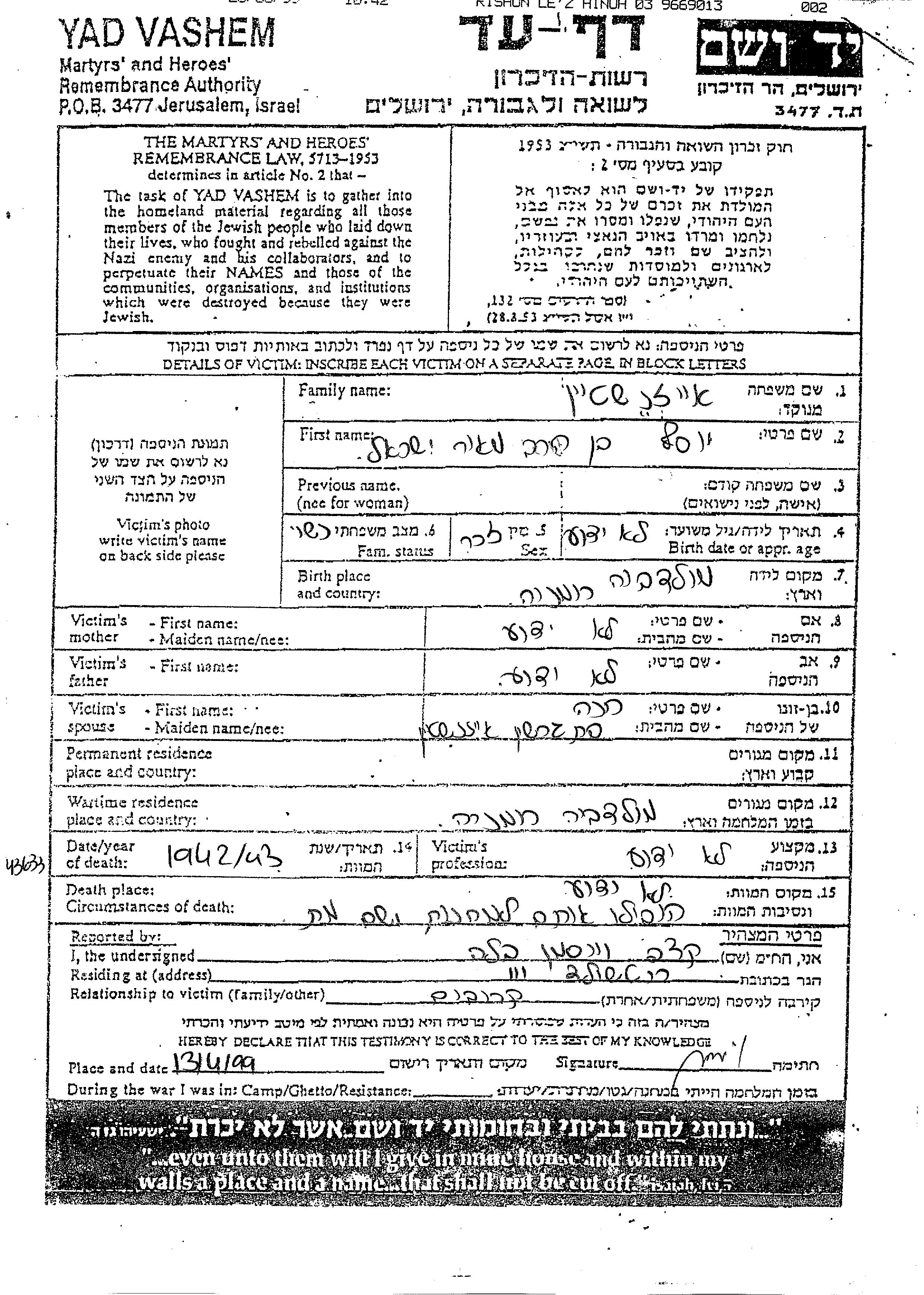 Yosef wurde in der Schoah ermordet. Todesort: unbekannt im Jahr 1942.