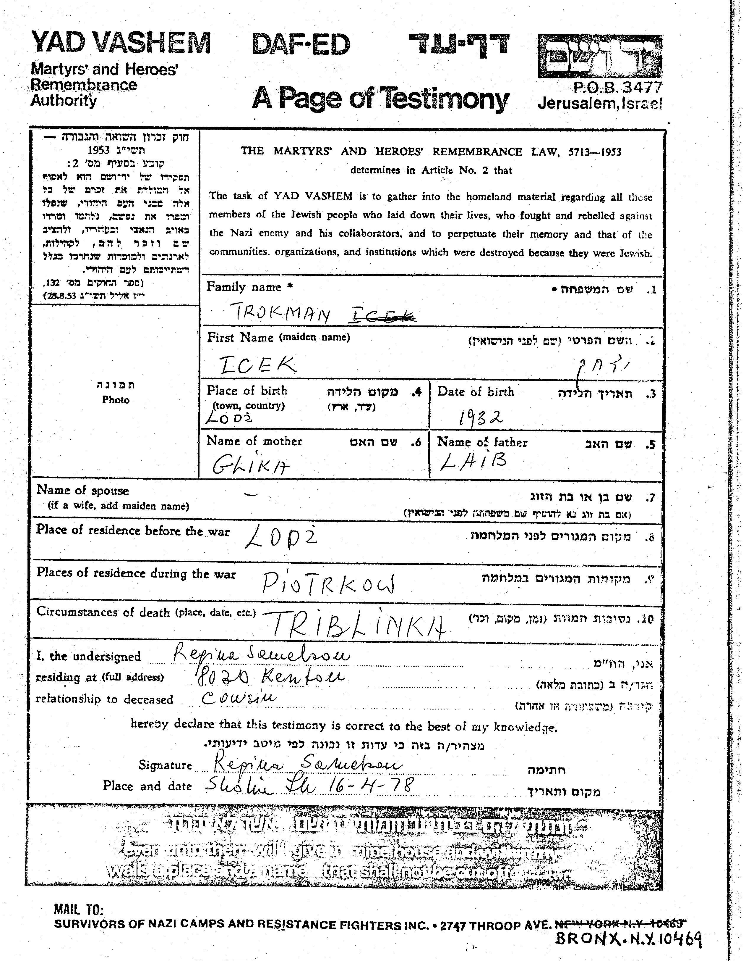 Icek Trokman wurde im Jahr 1932 in Lodz, Polen geboren. Er war der Sohn von Laib und Glika. Vor dem Zweiten Weltkrieg lebte er in Lodz, Polen. Während des Krieges war er in Piotrkow, Polen.