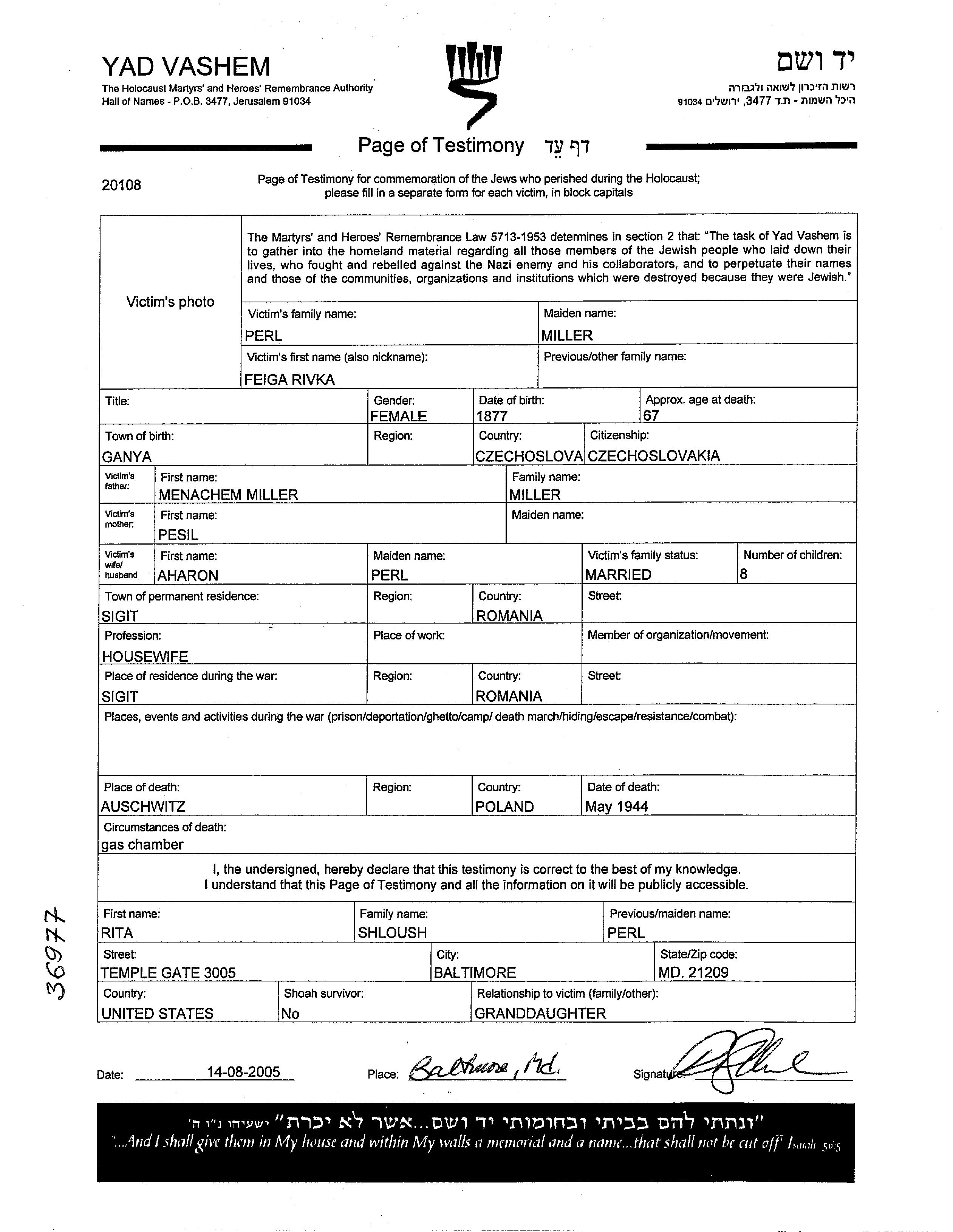 Feiga Rivka Perl, geb. Miller wurde im Jahr 1877 in Ganya, Tschechoslowakei geboren. Sie war die Tochter von Menachem und Pesil. Sie war Hausfrau und mit Aharon Verheiratet. Vor dem Zweiten Weltkrieg lebte sie in Sigit, Rumänien. Während des Krieges war sie in Sigit, Rumänien.