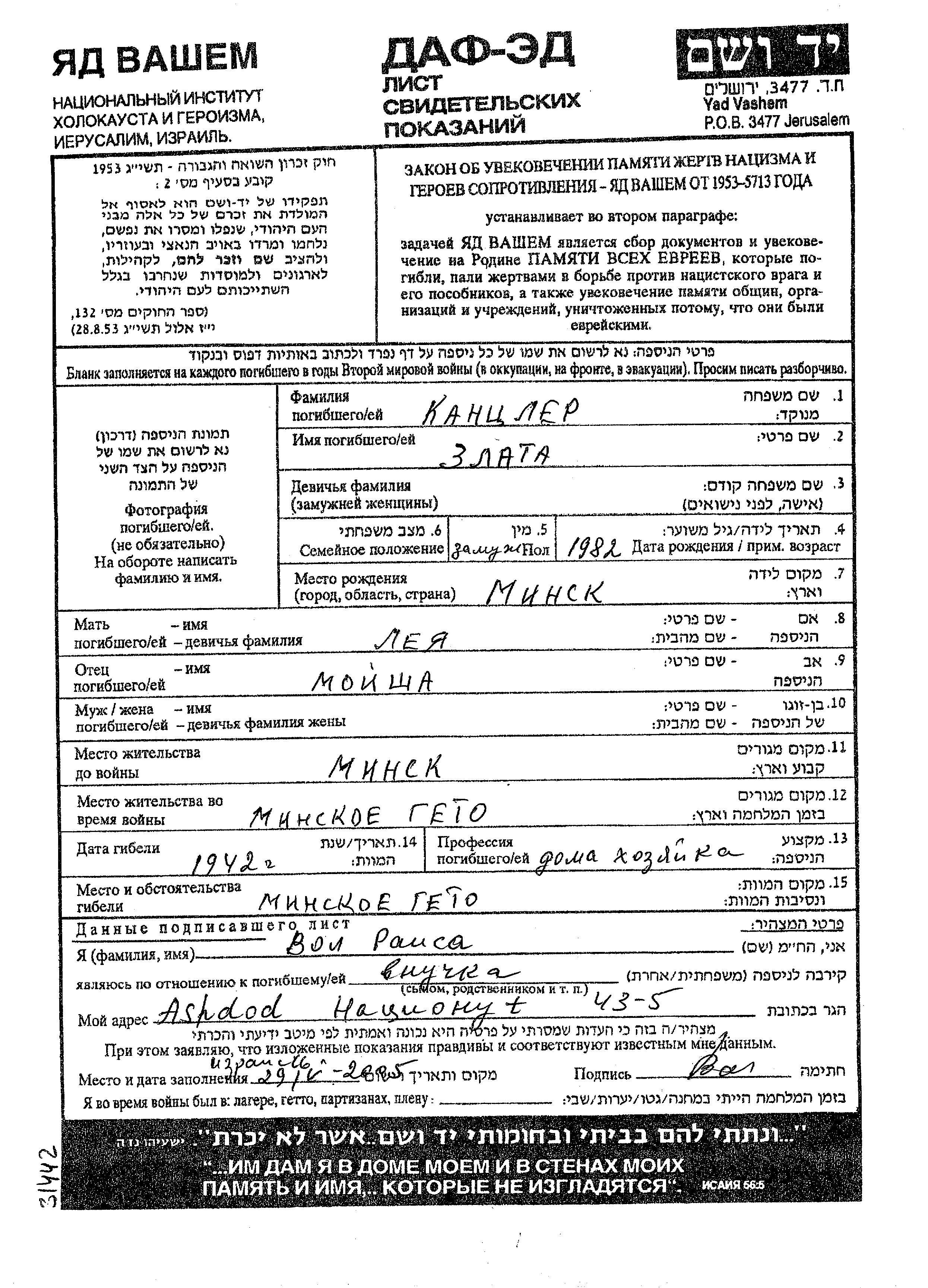 Zlata Kantzler wurde im Jahr 1882 in Minsk, Weißrussland (UdSSR) geboren. Sie war die Tochter von Moisha und Leya. Sie war Hausfrau und Verheiratet. Vor dem Zweiten Weltkrieg lebte sie in Minsk, Weißrussland (UdSSR). Während des Krieges war sie in Minsk, Weißrussland (UdSSR).