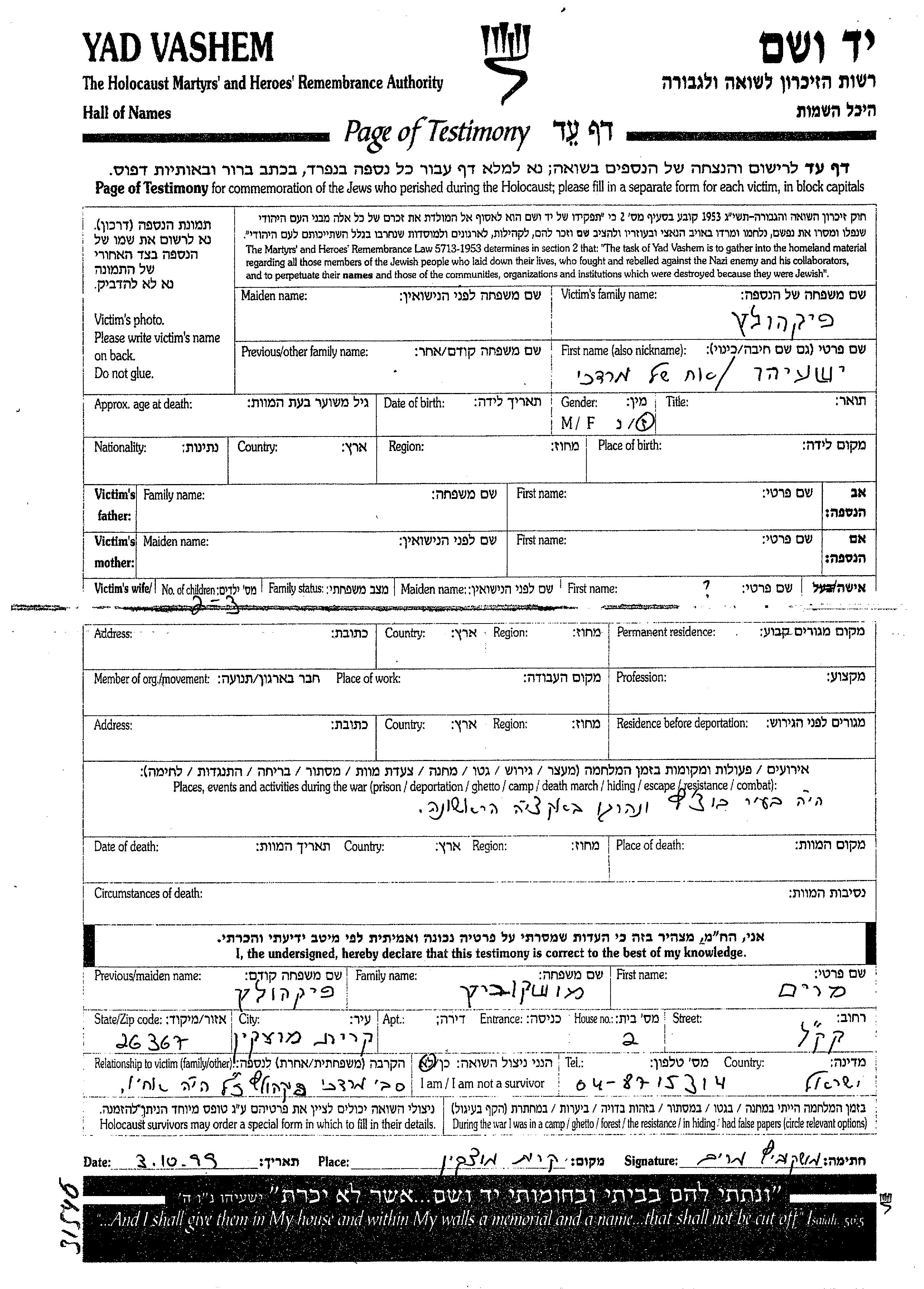 Pikholtz Yeshayahu unbekannter Ort, Gedenkblatt