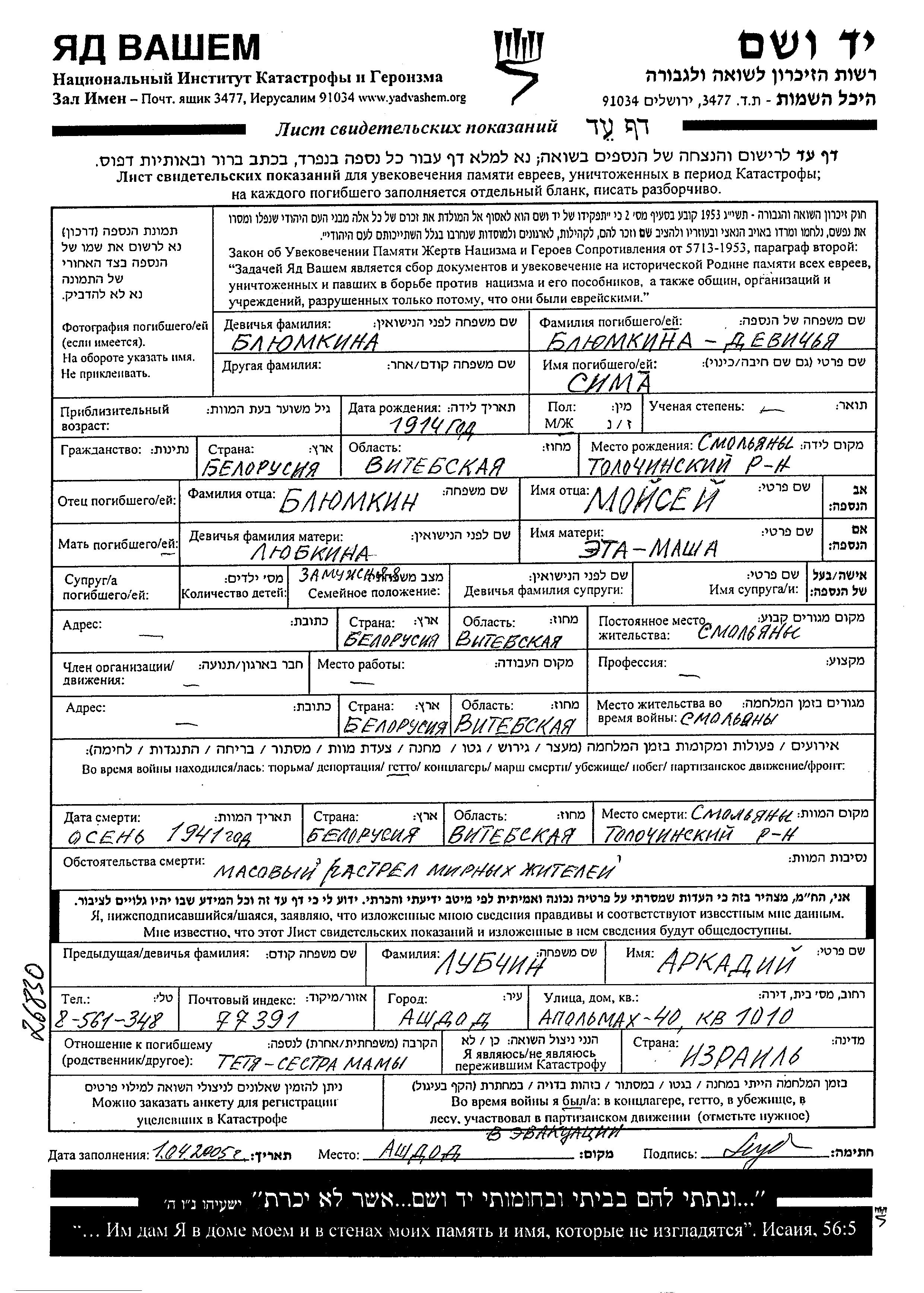 Sima Name unbekannt, geb. Blyumkina wurde im Jahr 1914 in Smolyany, Weißrussland (UdSSR) geboren. Sie war die Tochter von Moisei und Eta Masha, geb. Lyubkina. Sie war Verheiratet. Vor dem Zweiten Weltkrieg lebte sie in Smolyany, Weißrussland (UdSSR). Während des Krieges war sie in Smolyany, Weißrussland (UdSSR).