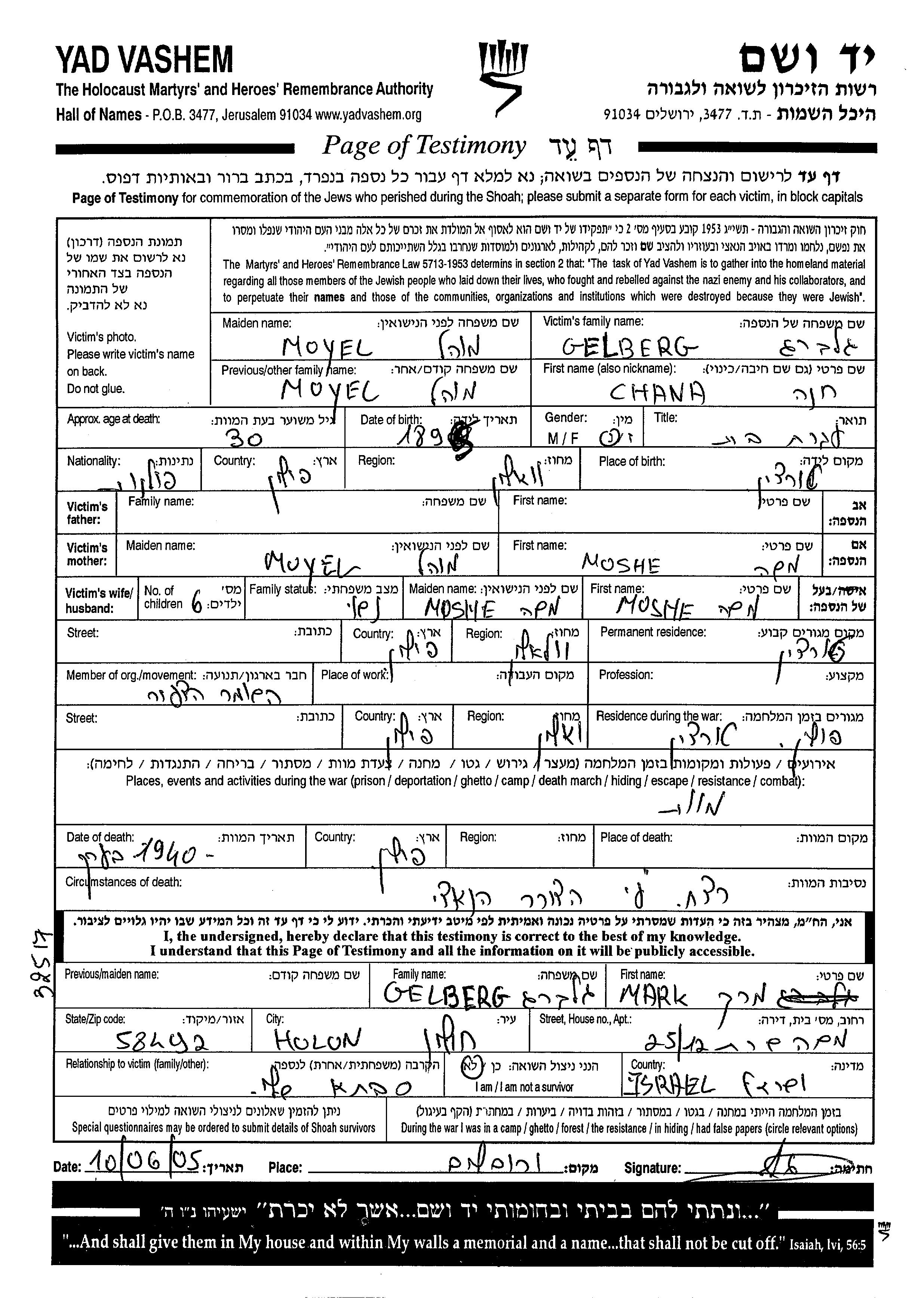 Chana Gelberg, geb. Moyel wurde im Jahr 1895 in Turczyn, Polen geboren. Sie war Hausfrau und mit Moshe Verheiratet. Vor dem Zweiten Weltkrieg lebte sie in Turczyn, Polen. Während des Krieges war sie in Turczyn, Polen.