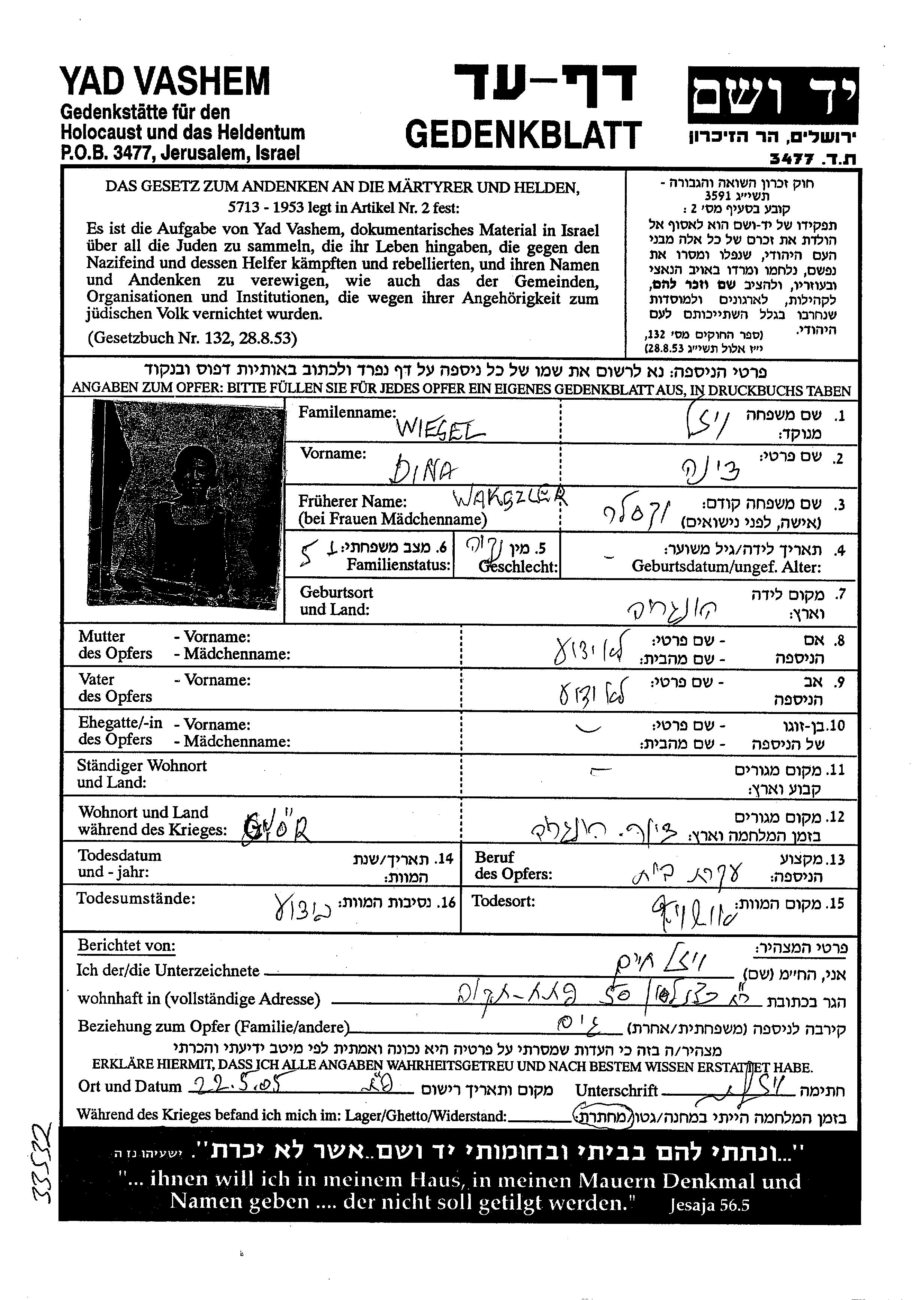 Dina wurde in der Schoah ermordet. Todesort: Auschwitz, Polen.