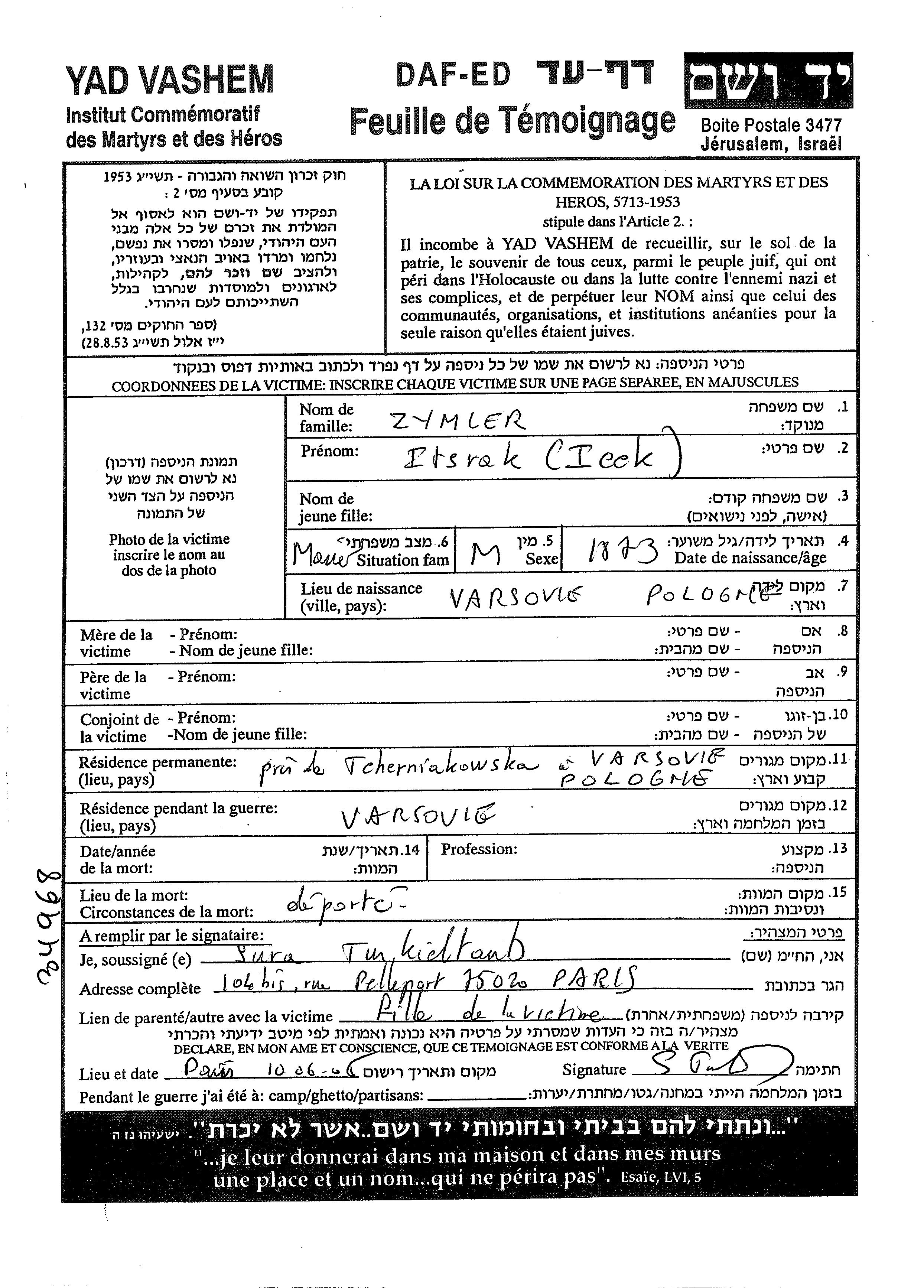 Itsrak Zymler wurde im Jahr 1873 in Varsovie, Polen geboren. Er war Verheiratet. Vor dem Zweiten Weltkrieg lebte er in Varsovie, Polen. Während des Krieges war er in Varsovie, Polen.