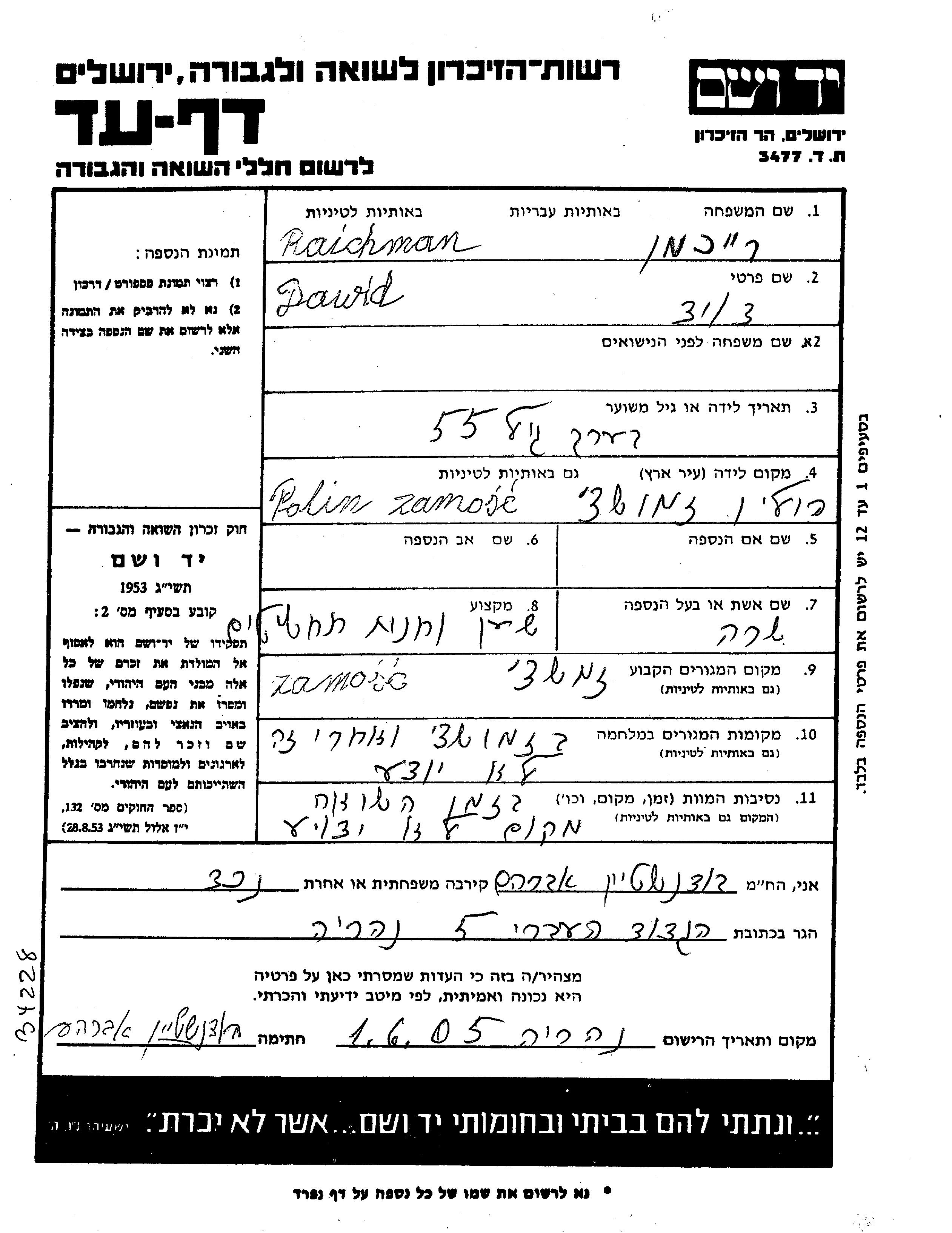 Reikhman Dawid Zamosc, Polen Gedenkblatt