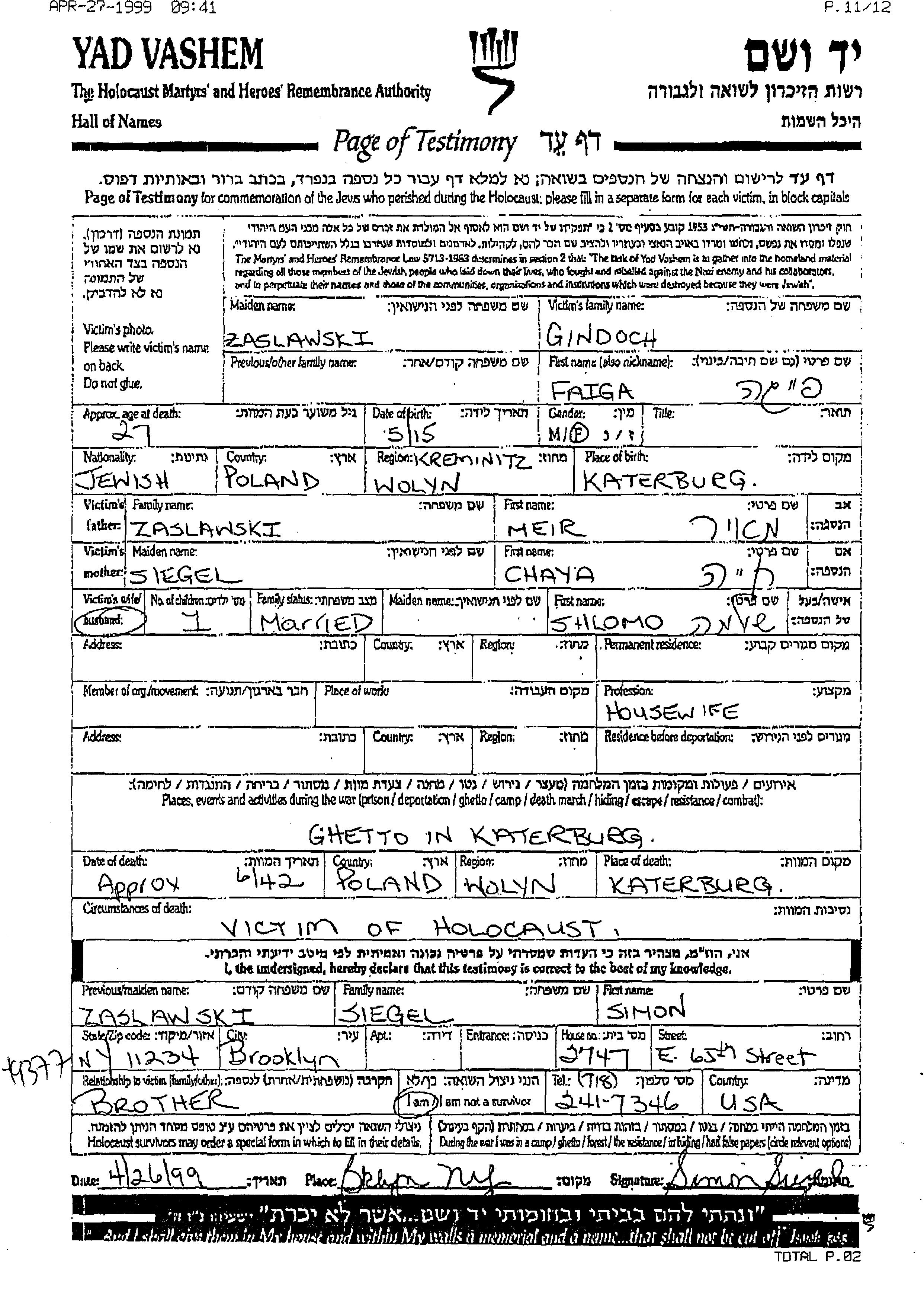 Feiga Gindoch, geb. Zaslawski wurde im Jahr 1915 in Katerburg, Polen geboren. Sie war die Tochter von Meir und Chaya, geb. Siegel. Sie war Hausfrau und mit Shlomo Verheiratet. Während des Krieges war sie in Getto.