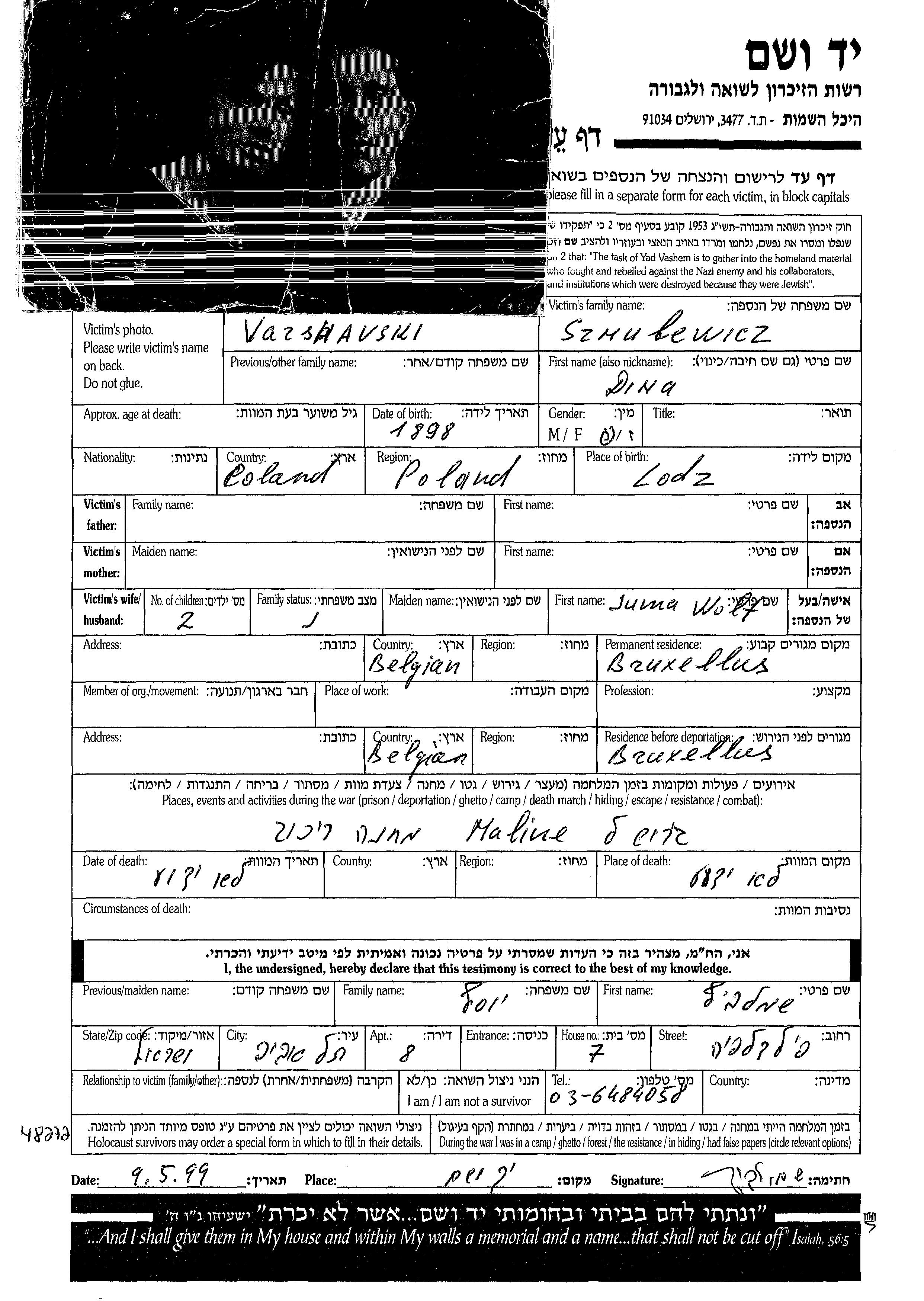 Dina Szmulewicz, geb. Varshavski wurde im Jahr 1898 in Lodz, Polen geboren. Sie war mit Juma Wolf Verheiratet. Vor dem Zweiten Weltkrieg lebte sie in Bruxelles, Belgien. Während des Krieges war sie in Bruxelles, Belgien.