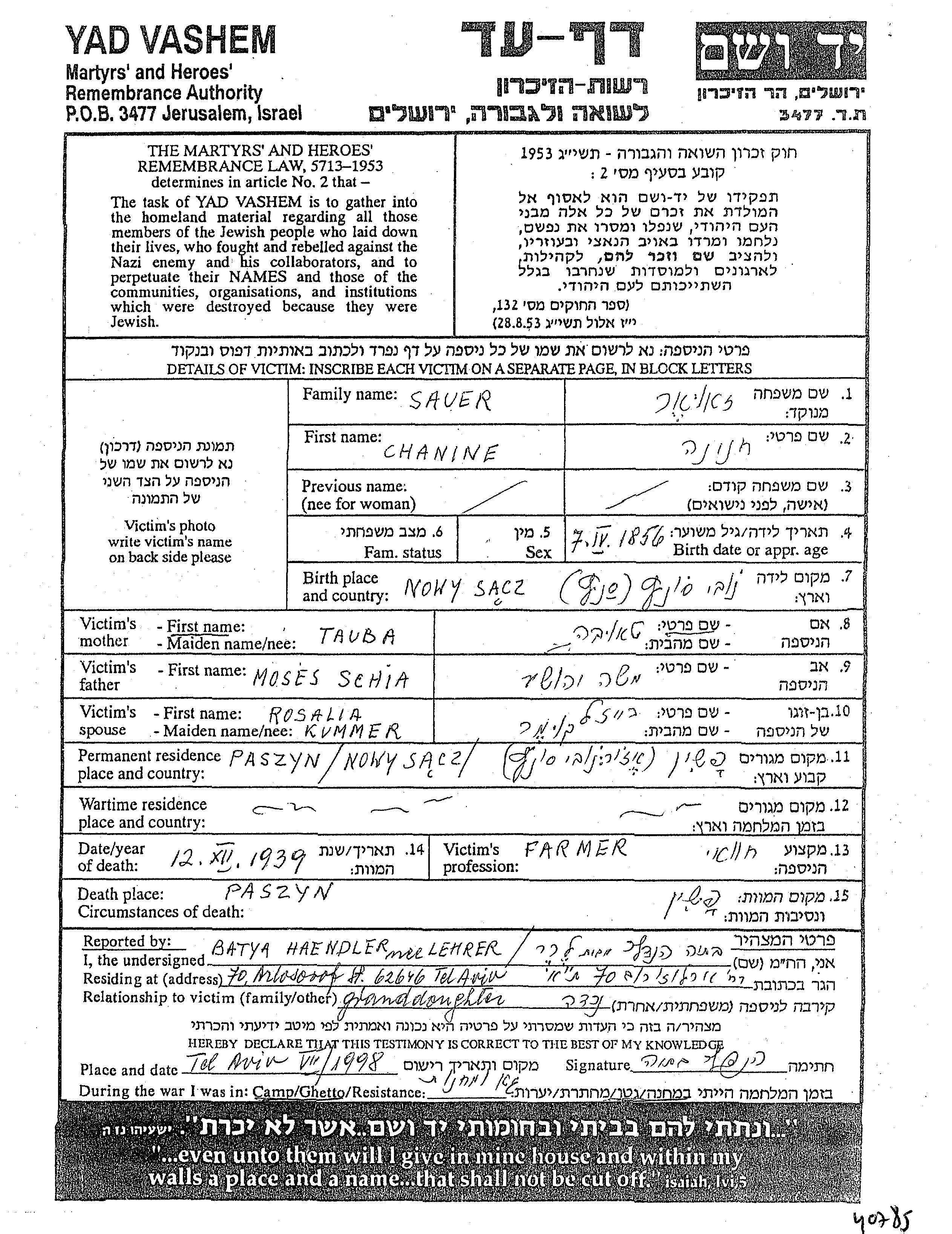 Chanine Khanina Zauer wurde im Jahr 1856 in Nowy Sacz, Polen geboren. Er war der Sohn von Yehoshua Moshe und Tauba. Er war Großbauer/-bäuerin. Vor dem Zweiten Weltkrieg lebte er in Paszyn, Polen. Während des Krieges war er in Paszyn, Polen.