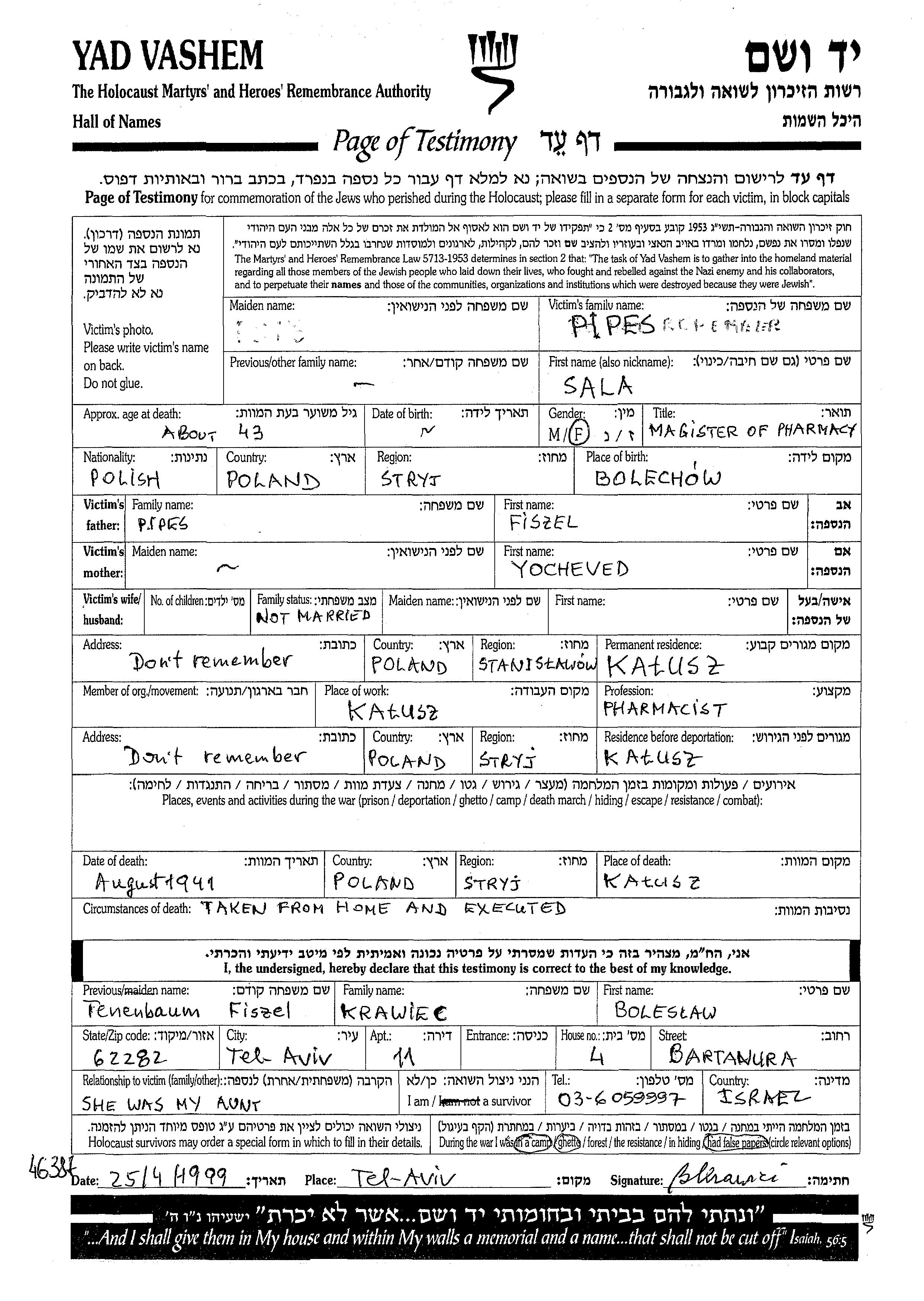 Sala Pipes wurde in Bolechow, Polen geboren. Sie war die Tochter von Fiszel und Yocheved. Sie war Apotheker/-in und Ledig. Vor dem Zweiten Weltkrieg lebte sie in Kalusz, Polen. Während des Krieges war sie in Kalusz, Polen.