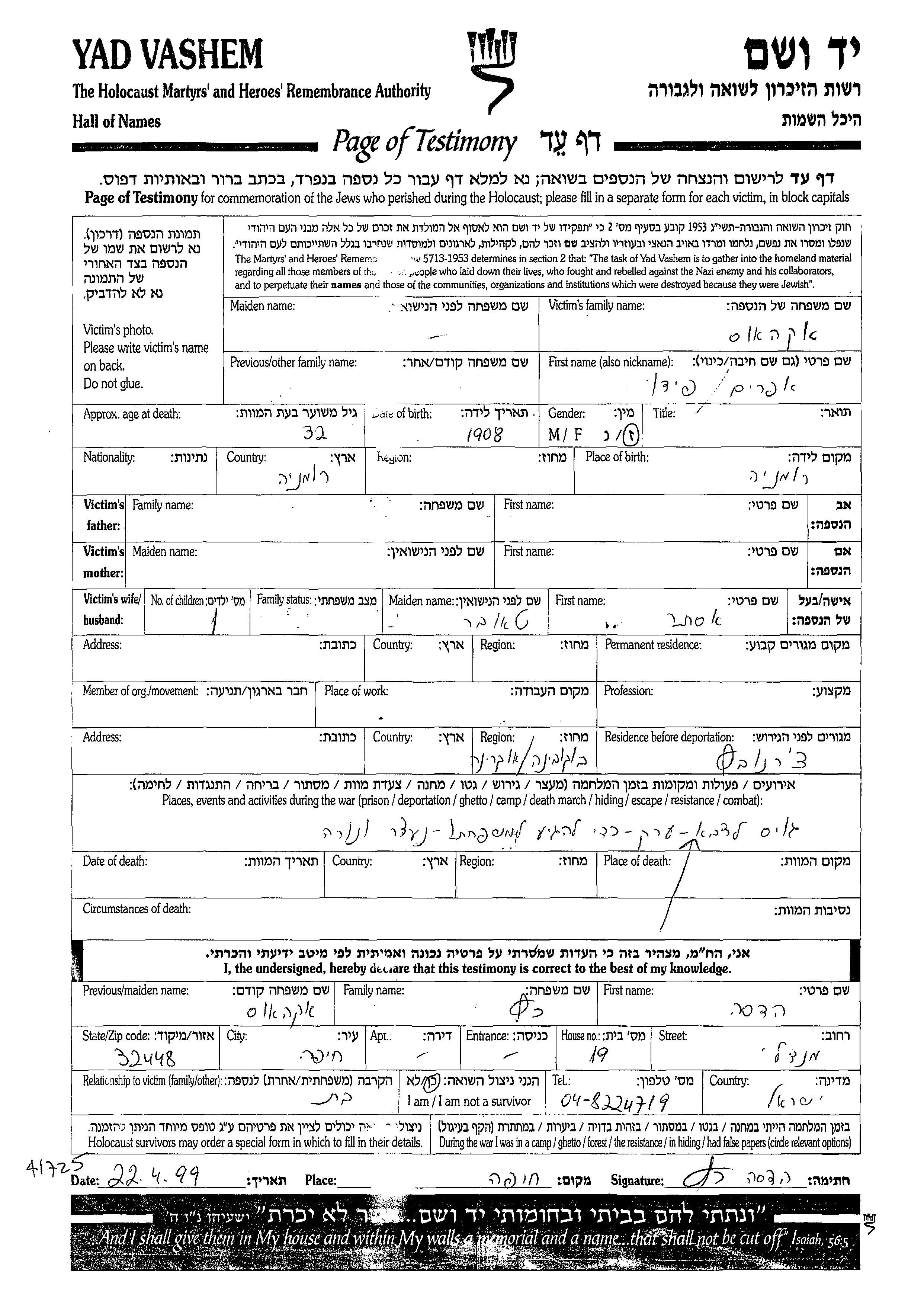 Efraim Ekhauz wurde im Jahr 1908 in Rumänien geboren. Er war mit Ester, geb. Tauber Verheiratet. Während des Krieges war er in Cernauti, Rumänien.