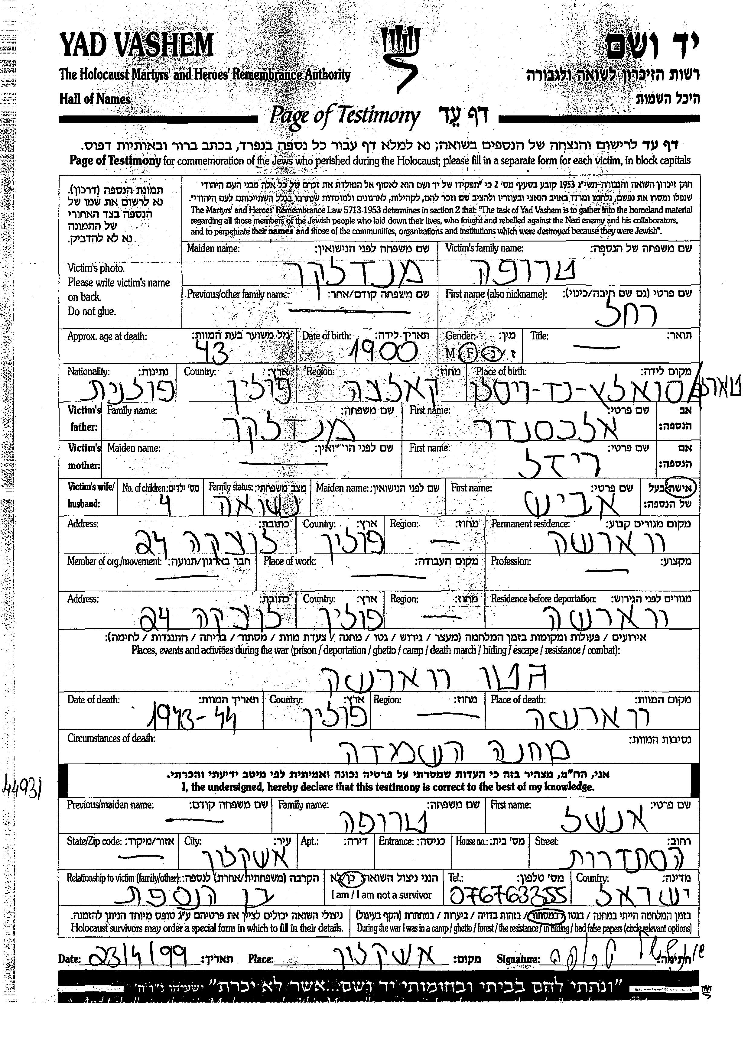 Rakhel Tropa, geb. Mandelker wurde im Jahr 1900 in Tarle, Polen geboren. Sie war die Tochter von Aleksander und Reizel. Sie war mit Aba Verheiratet. Vor dem Zweiten Weltkrieg lebte sie in Warsaw, Polen. Während des Krieges war sie in Warsaw, Polen.