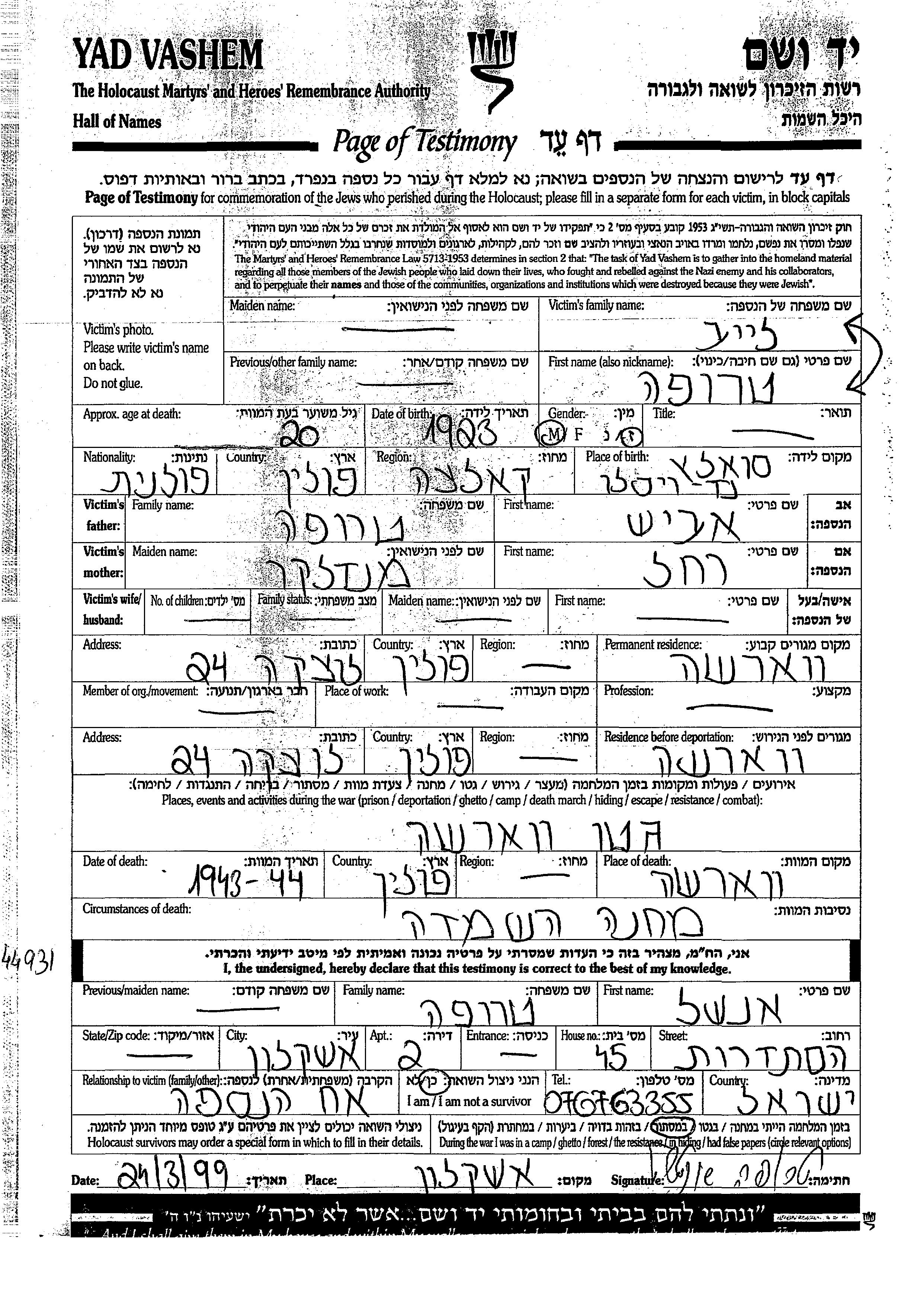Leib Tropa wurde im Jahr 1923 in Solec nad Wisla, Polen geboren. Er war der Sohn von Avishai und Rakhel, geb. Mandelker. Er war Ledig. Vor dem Zweiten Weltkrieg lebte er in Warszawa, Polen. Während des Krieges war er in Warszawa, Polen.