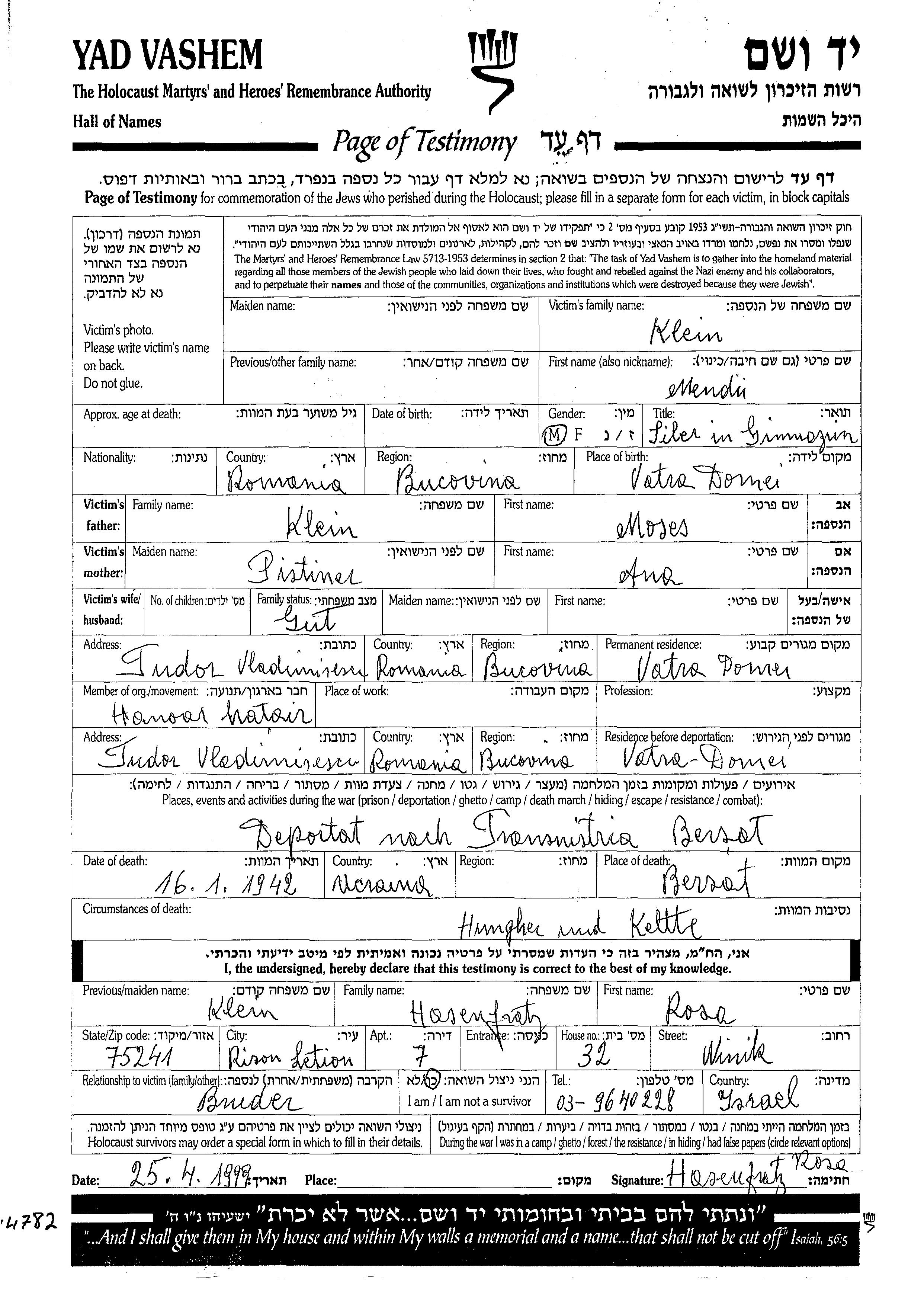 Mendu Klein wurde in Vatra Dornei, Rumänien geboren. Er war der Sohn von Moses und Ana, geb. Pistiner. Vor dem Zweiten Weltkrieg lebte er in Vatra Dornei, Rumänien. Während des Krieges war er in Vatra Dornei, Rumänien.