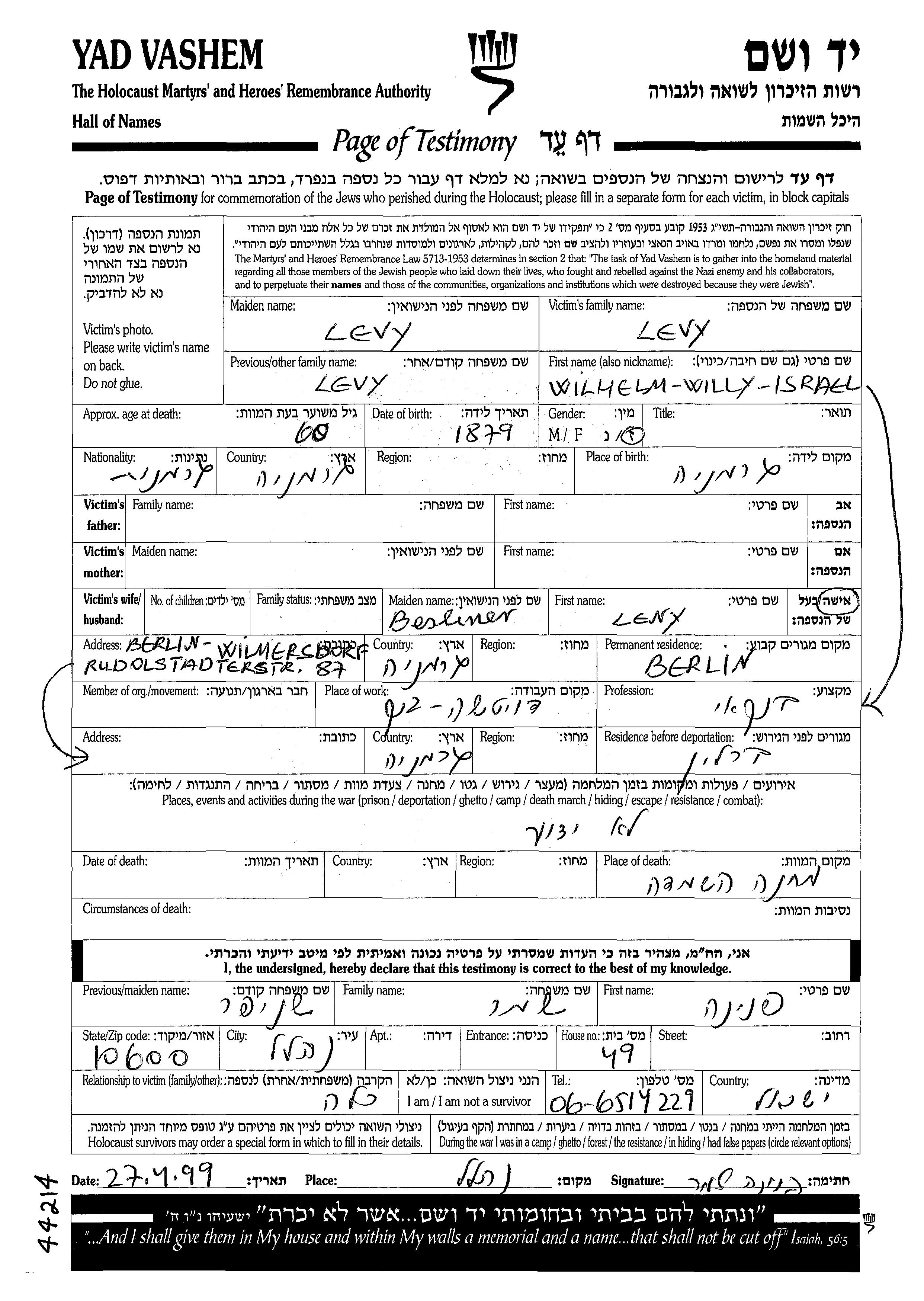 Israel Willy Levy wurde im Jahr 1879 in Deutsches Reich geboren. Er war Bankier und mit Leny, geb. Berliner Verheiratet. Vor dem Zweiten Weltkrieg lebte er in Berlin, Deutsches Reich. Während des Krieges war er in Berlin, Deutsches Reich.