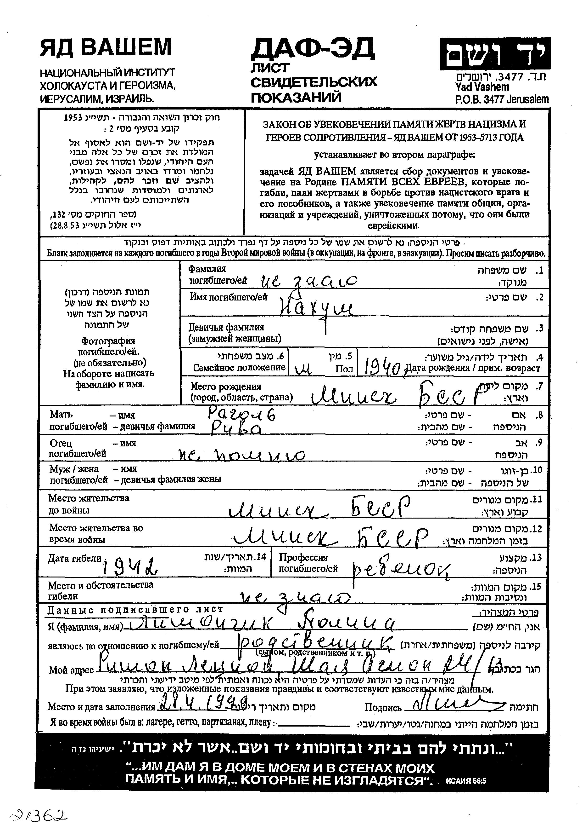 Name unbekannt Nakhum 1940 Minsk, Weißrussland (UdSSR) Gedenkblatt