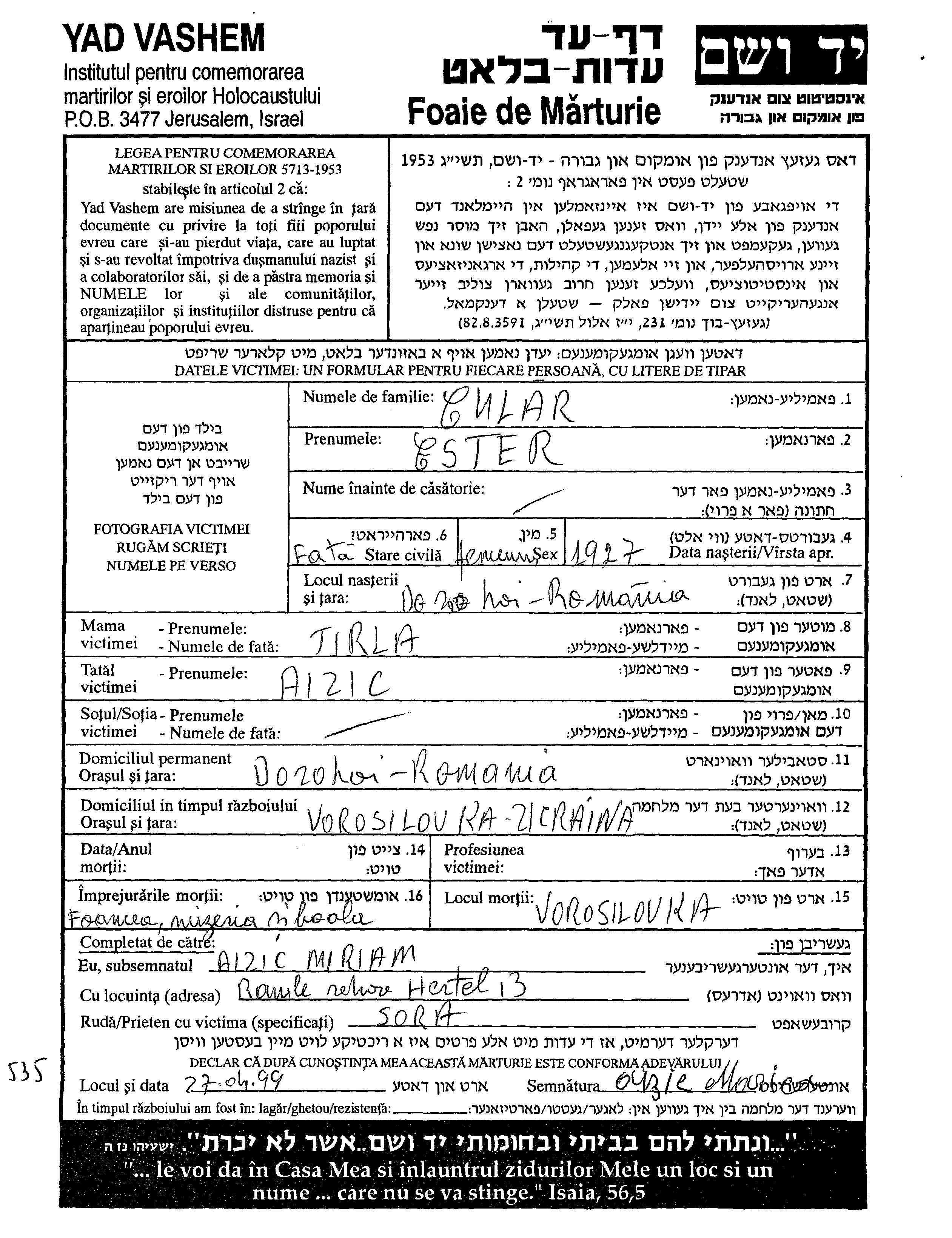 Ester wurde in der Schoah ermordet. Todesort: Voroshilovka, Ukraine (UdSSR).