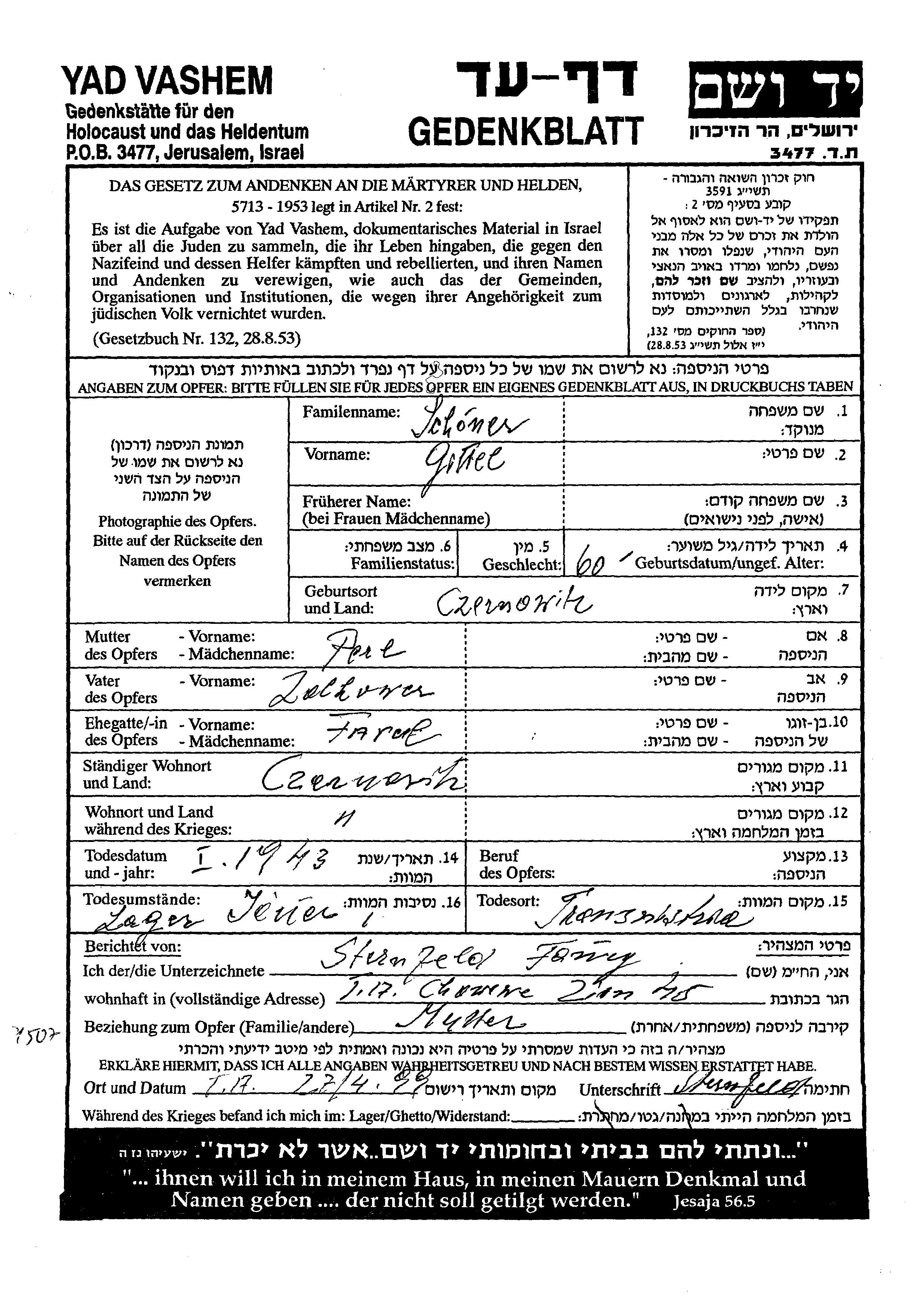 Gittel Schoner, geb. Zolkower wurde in Czernowitz, Rumänien geboren. Sie war die Tochter von Perl. Sie war mit Faval Verheiratet. Vor dem Zweiten Weltkrieg lebte sie in Czernowitz, Rumänien. Während des Krieges war sie in Czernowitz, Rumänien.