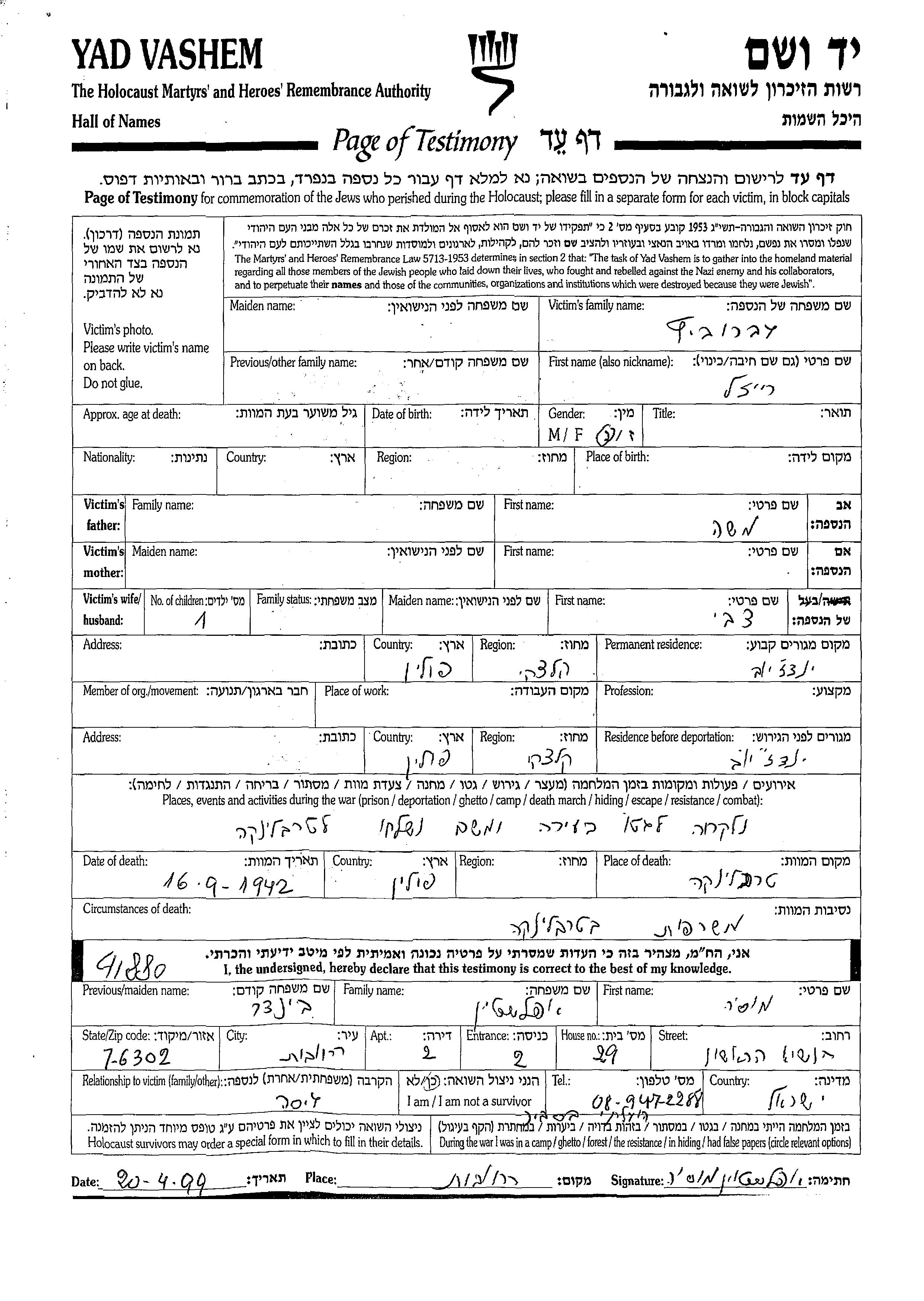 Reizl Gebrovitz wurde Sie war die Tochter von Moshe. Vor dem Zweiten Weltkrieg lebte sie in Jendrzejov, Polen. Während des Krieges war sie in Getto. Reizl wurde in der Schoah ermordet. Todesort: Treblinka, Polen im Jahr 16/09/1942.