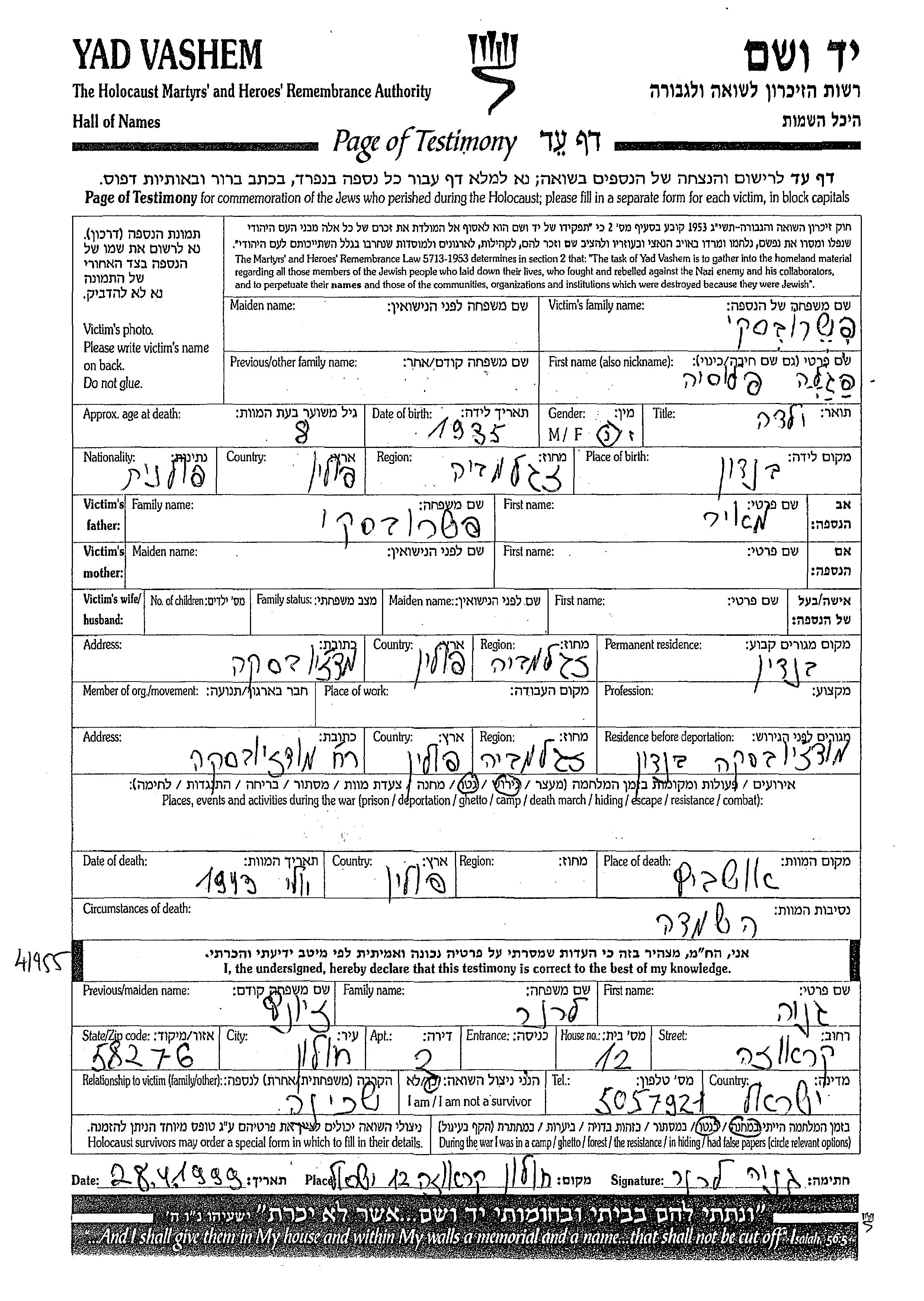 Feiga Felusia Psherovski wurde im Jahr 1935 in Bendin, Polen geboren. Sie war die Tochter von Meir. Vor dem Zweiten Weltkrieg lebte sie in Bendin, Polen. Während des Krieges war sie in Będzin, Polen.