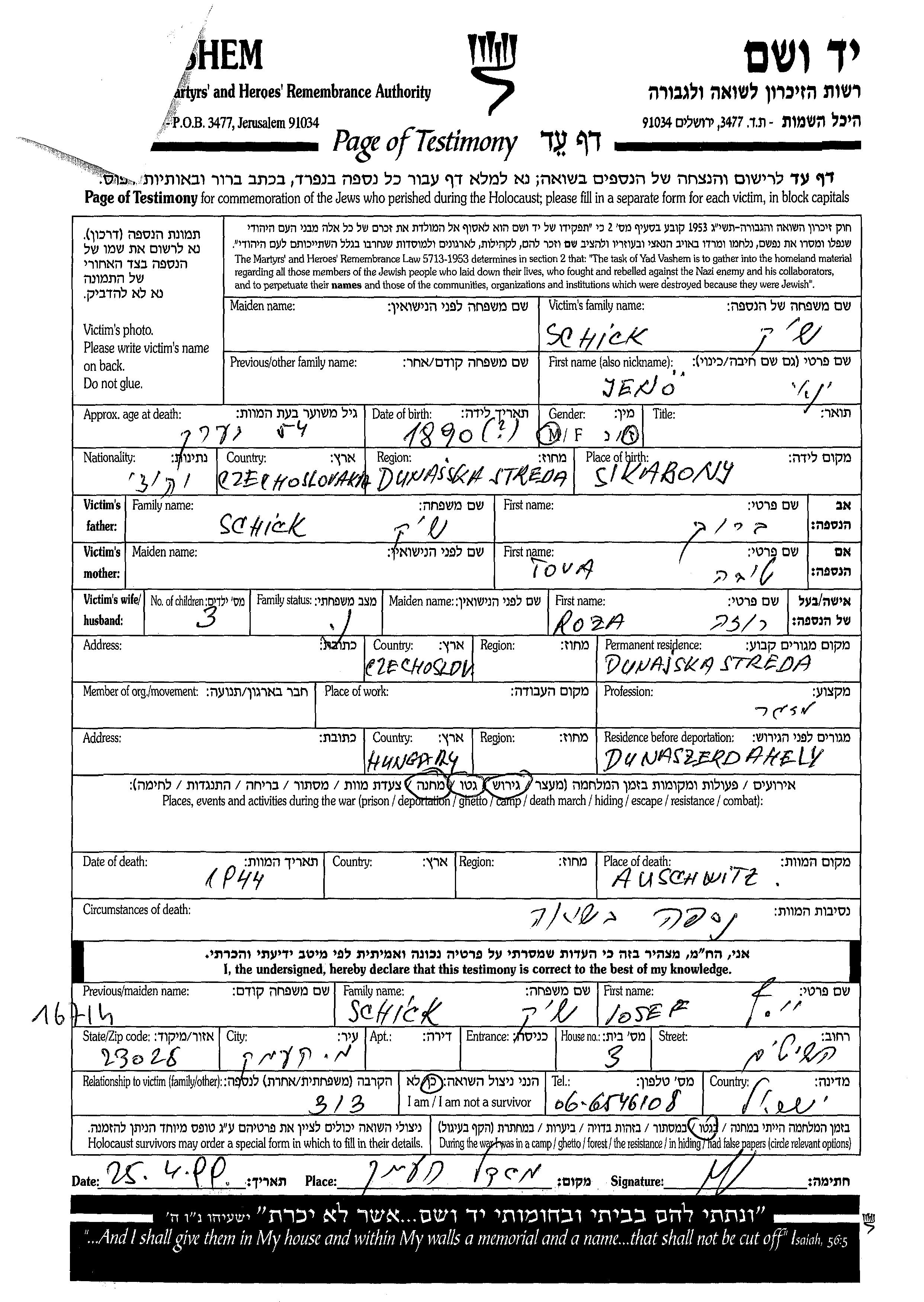 Yanay Jeno Shik wurde im Jahr 1890 in Sikabony, Tschechoslowakei geboren. Er war der Sohn von Barukh und Tova. Er war Schlosser und mit Roza Verheiratet. Vor dem Zweiten Weltkrieg lebte er in Dunajska Streda, Tschechoslowakei. Während des Krieges war er in Dunajska Streda, Tschechoslowakei.