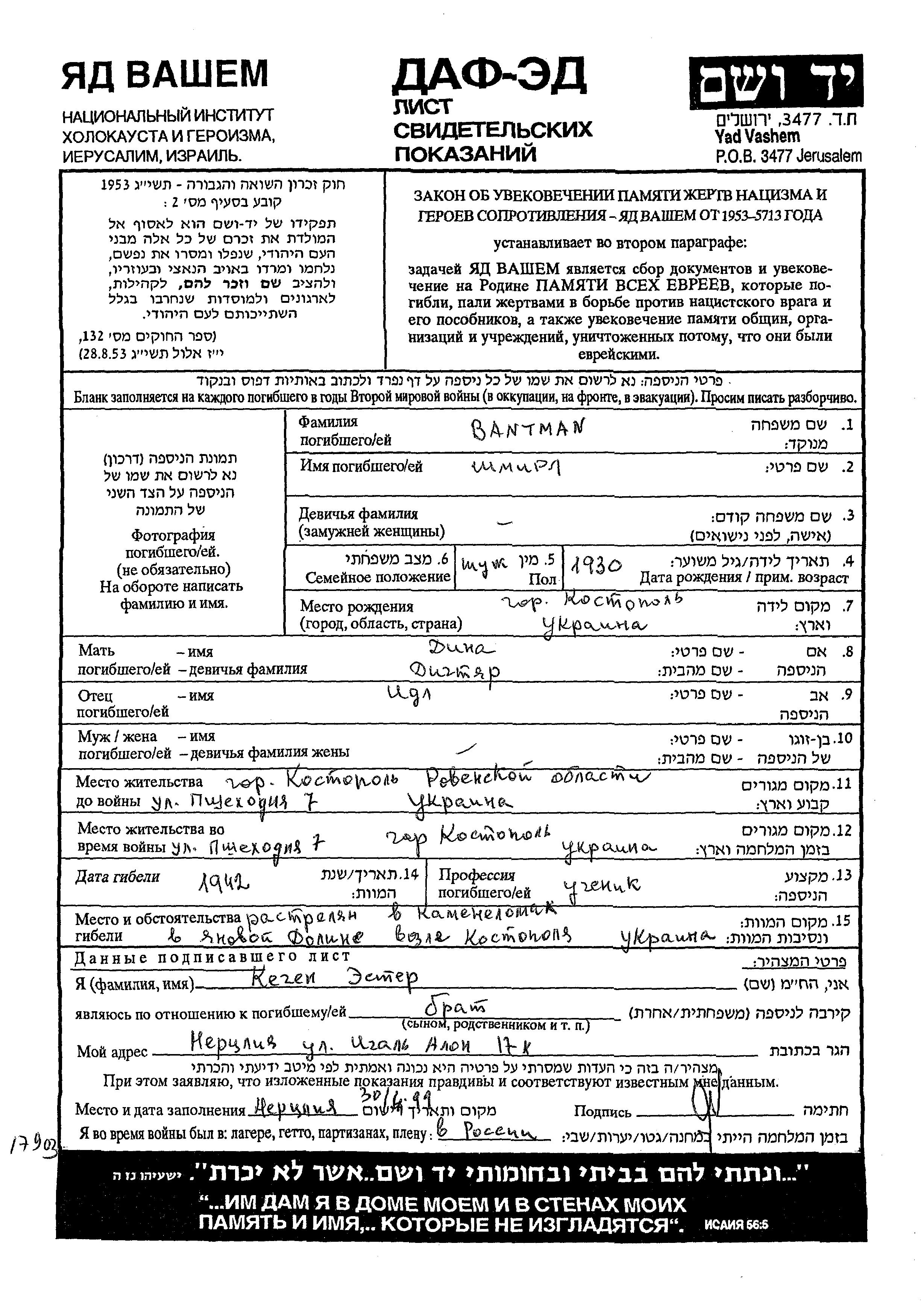 Shmirl Bantman wurde im Jahr 1930 in Kostopol, Polen geboren. Er war der Sohn von Idl und Dina, geb. Digtyar. Er war Schüler/-in und Kind. Vor dem Zweiten Weltkrieg lebte er in Kostopol, Polen. Während des Krieges war er in Kostopol, Polen.
