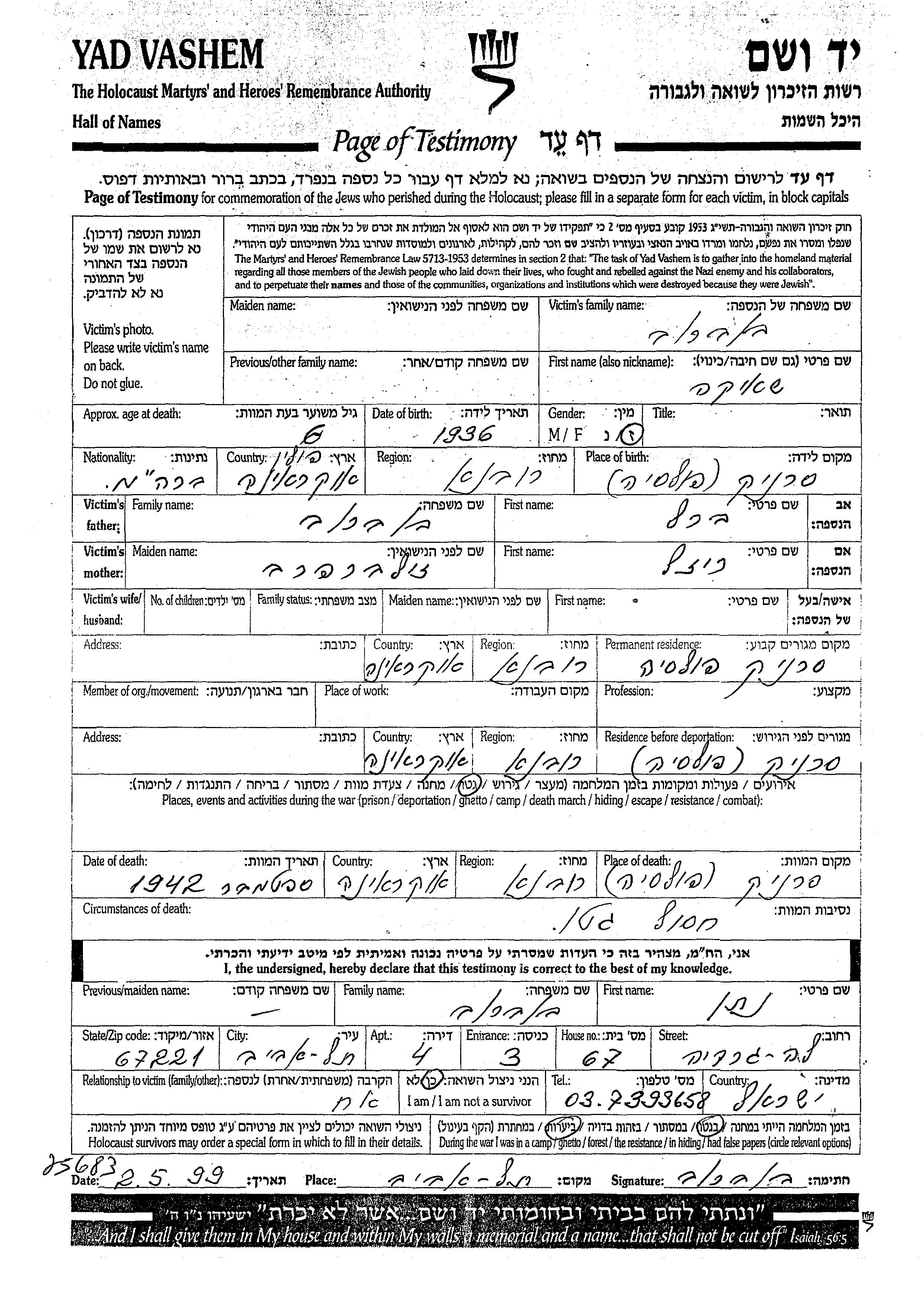 Sheyka wurde in der Schoah ermordet. Todesort: Sernik, Polen im Jahr 09/1942.