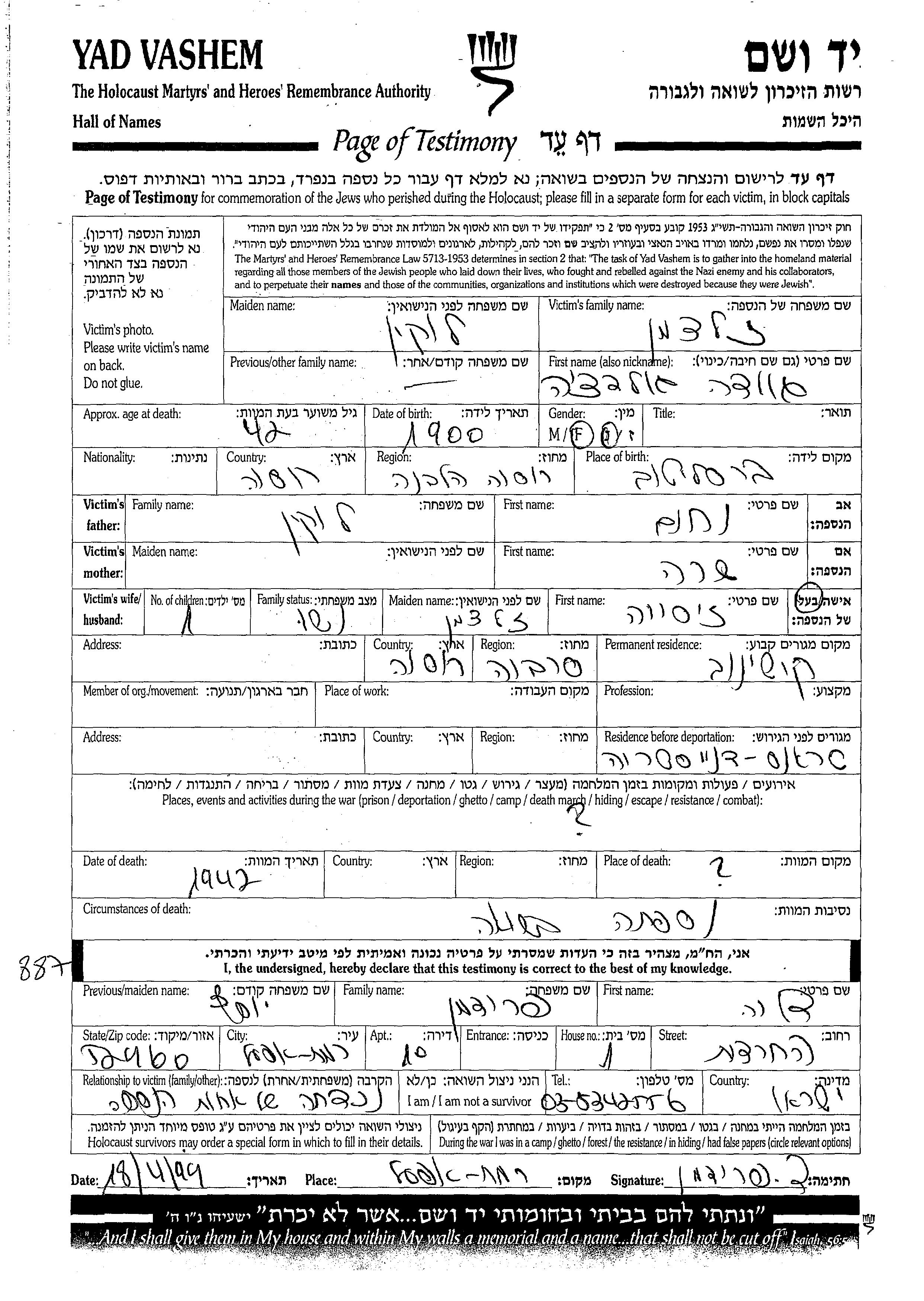 Golda Zaltzman, geb. Lukin wurde im Jahr 1900 in Bresc Litewski, Polen geboren. Sie war die Tochter von Nakhum und Sara. Sie war mit Zisia Verheiratet. Vor dem Zweiten Weltkrieg lebte sie in Kishinev, Rumänien. Während des Krieges war sie in Transnistria, Ukraine (UdSSR).